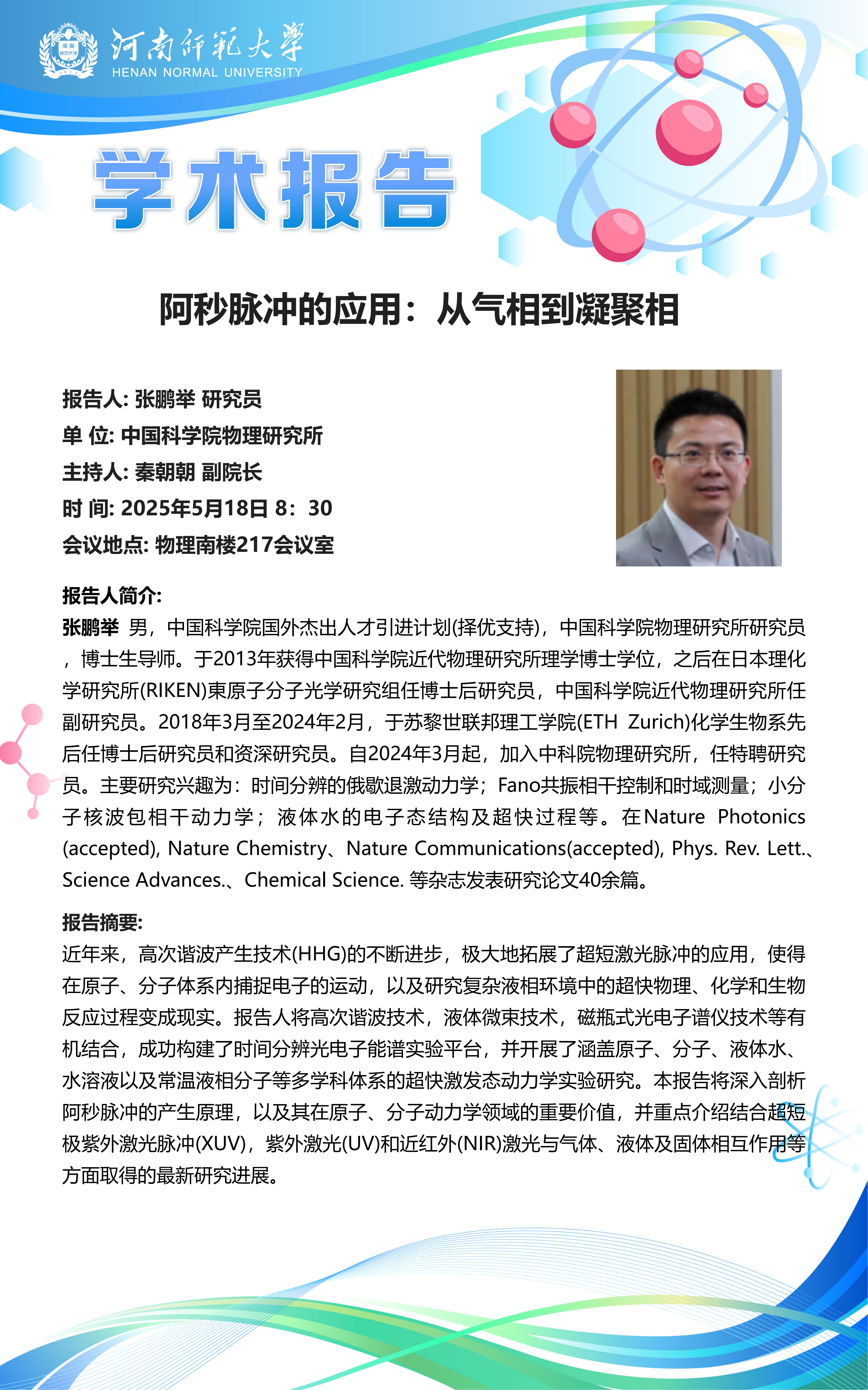 中国科学院物理研究所张鹏举研究员将应邀做客“八角楼”讲坛