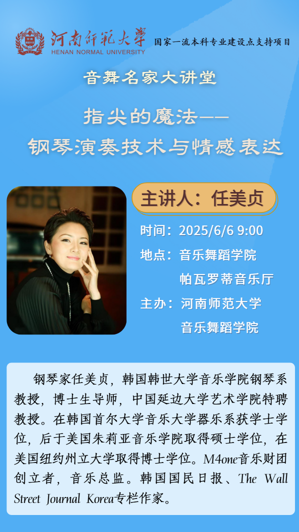 韩国韩世大学音乐学院教授、钢琴家任美贞将做客“音舞名家大讲堂”