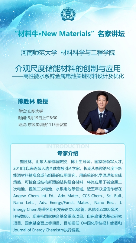 山东大学熊胜林教授将应邀做客“材料牛·NewMaterials”名家讲坛