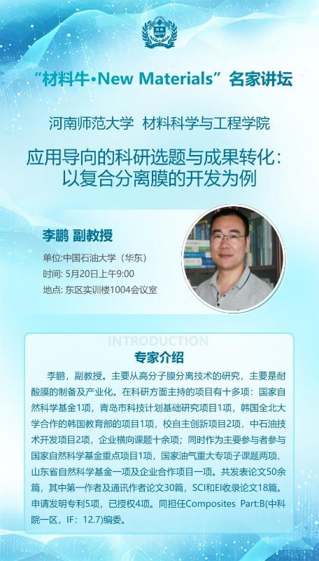 中国石油大学(华东)李鹏副教授将应邀做客“材料牛·NewMaterials”名家讲坛