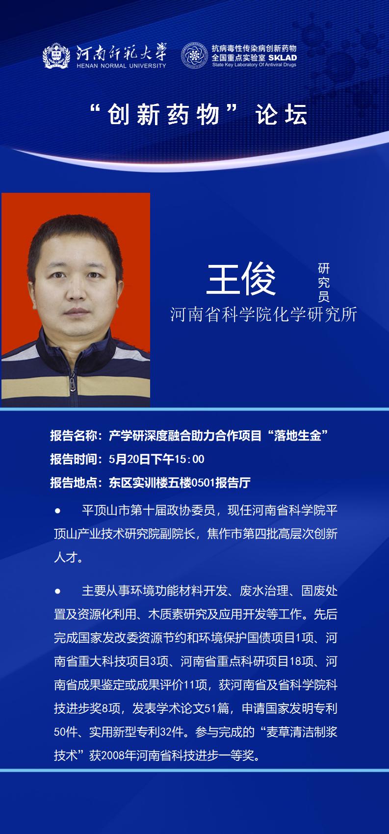 河南省科学院化学研究所王俊研究员将应邀做客“创新药物”论坛