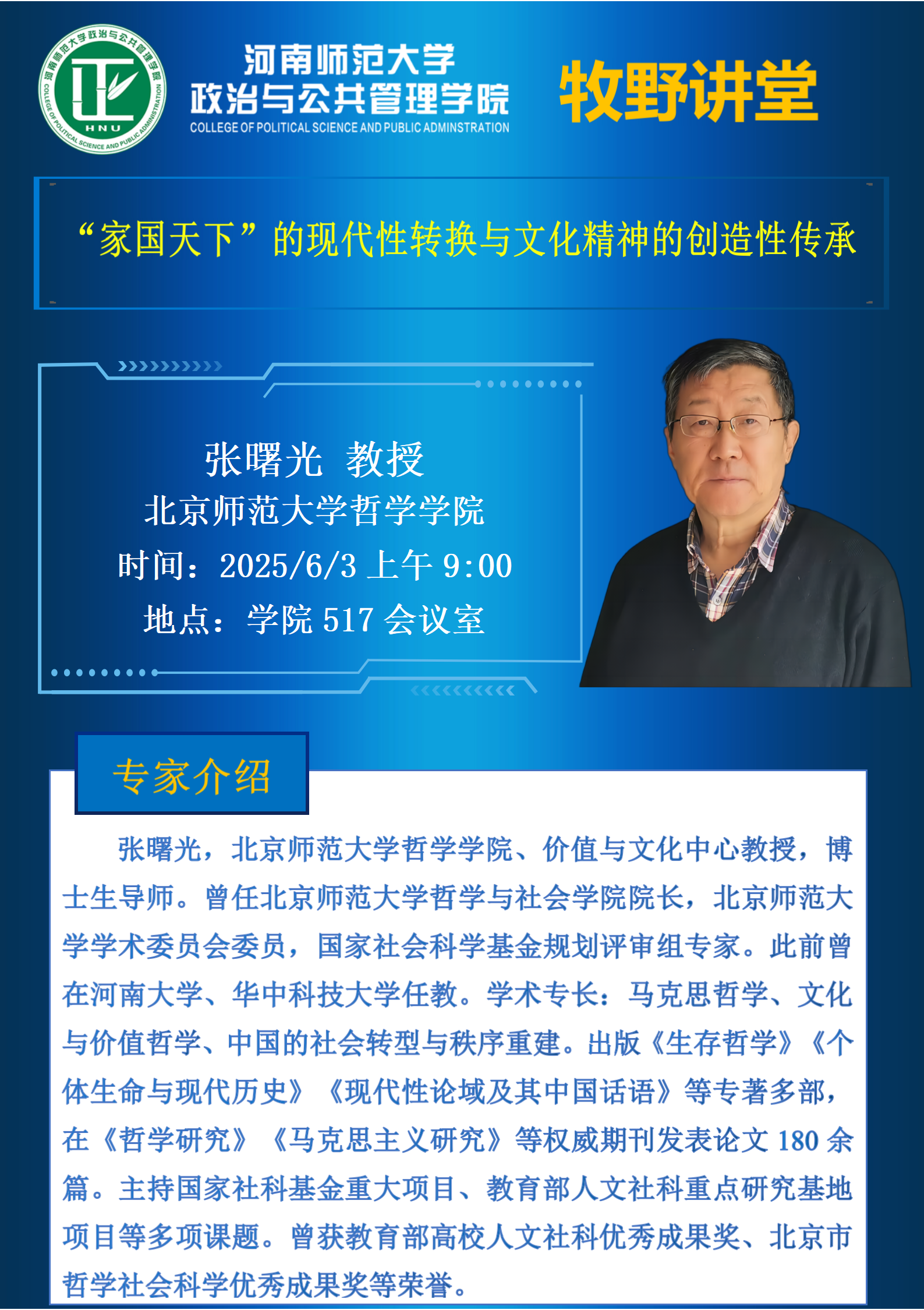 北京师范大学张曙光讲授将应邀做客“牧野讲堂”