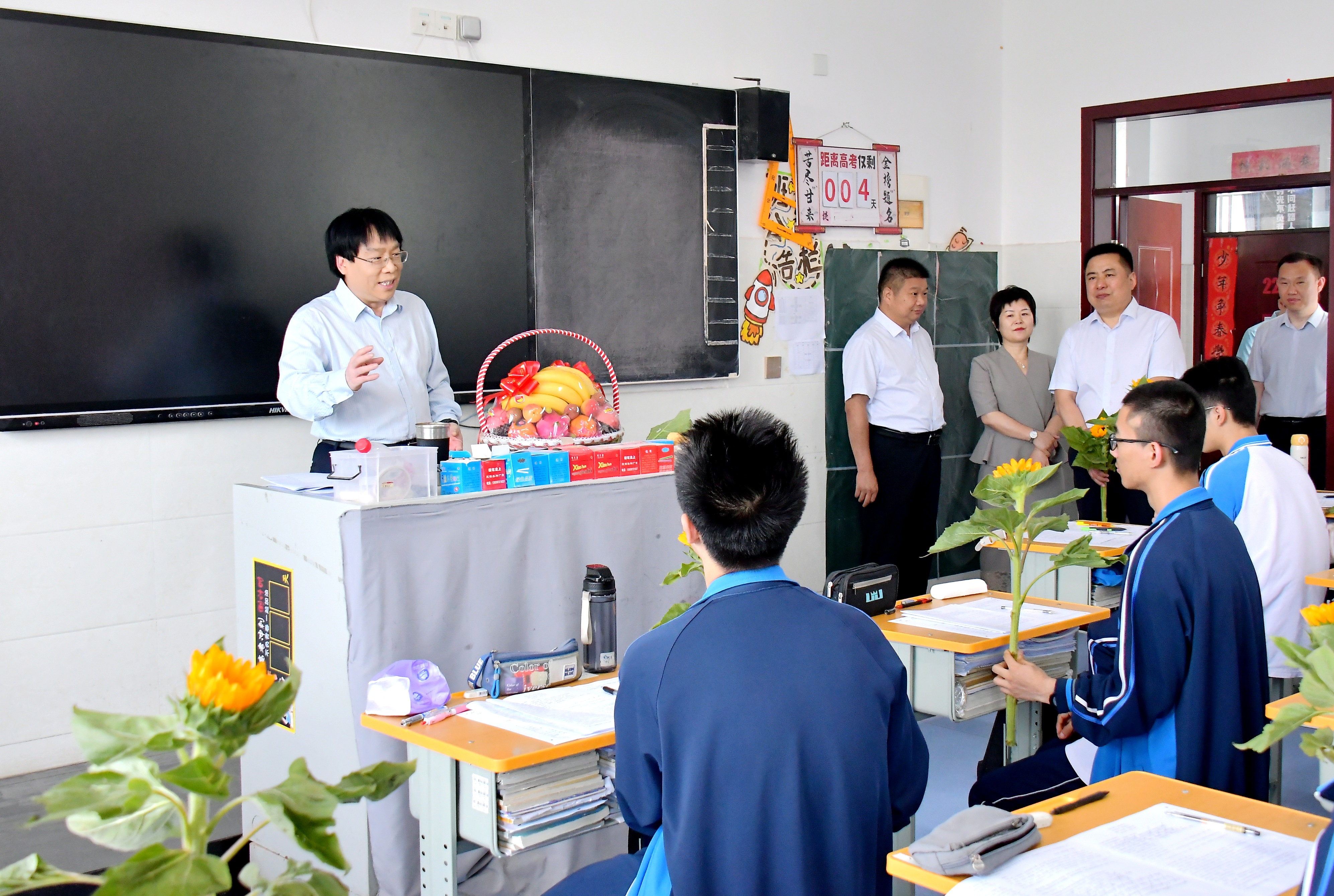 在2025年高考来临之际,6月3日上午,校长郭海明、副校长宋晔到附属中学调研高考备考及考点考务组织工作,看望慰问高三师生。党政办公室主要负责同志及附属中学领导班子陪同调研。