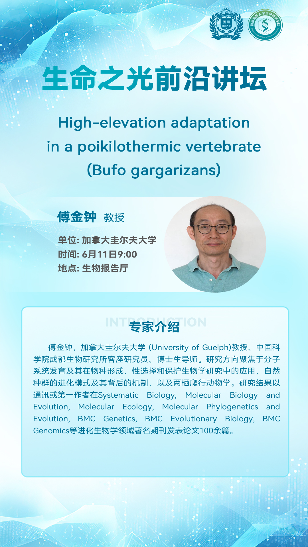 加拿大圭尔夫大学傅金钟教授将应邀做客“生命之光”前沿讲坛