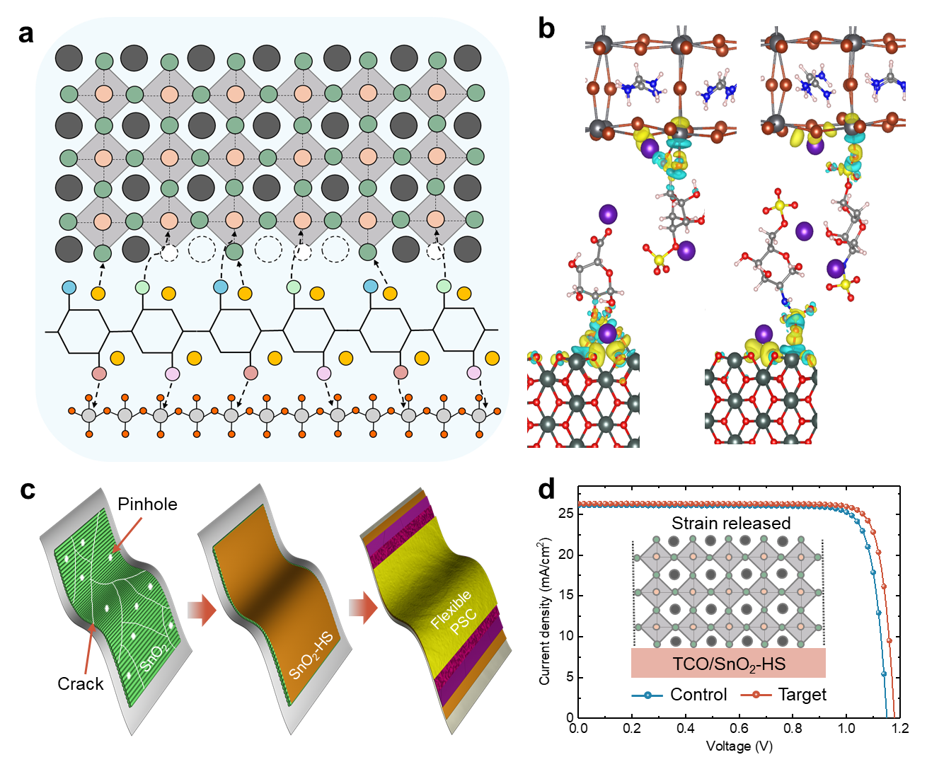 此项研究成果由我校材料科学与工程学院汤晓丹老师课题组牵头,联合中国科学院大学、沙特阿卜杜拉国王科技大学、海南大学、天津大学和西安交通大学等单位,采用界面调控策略,研究钙钛矿层和电子传输层之间的光电性能及器件衰减机制,通过多功能聚合物分子桥调控器件界面,有效增强了器件的界面结合力、电学性能和机械强度,显著提升了钙钛矿电池的光电转化效率和稳定性。这一重要研究成果不仅为钙钛矿太阳能电池技术的发展提供了有力支撑,更为其未来的产业化应用提供了切实可行的解决方案。