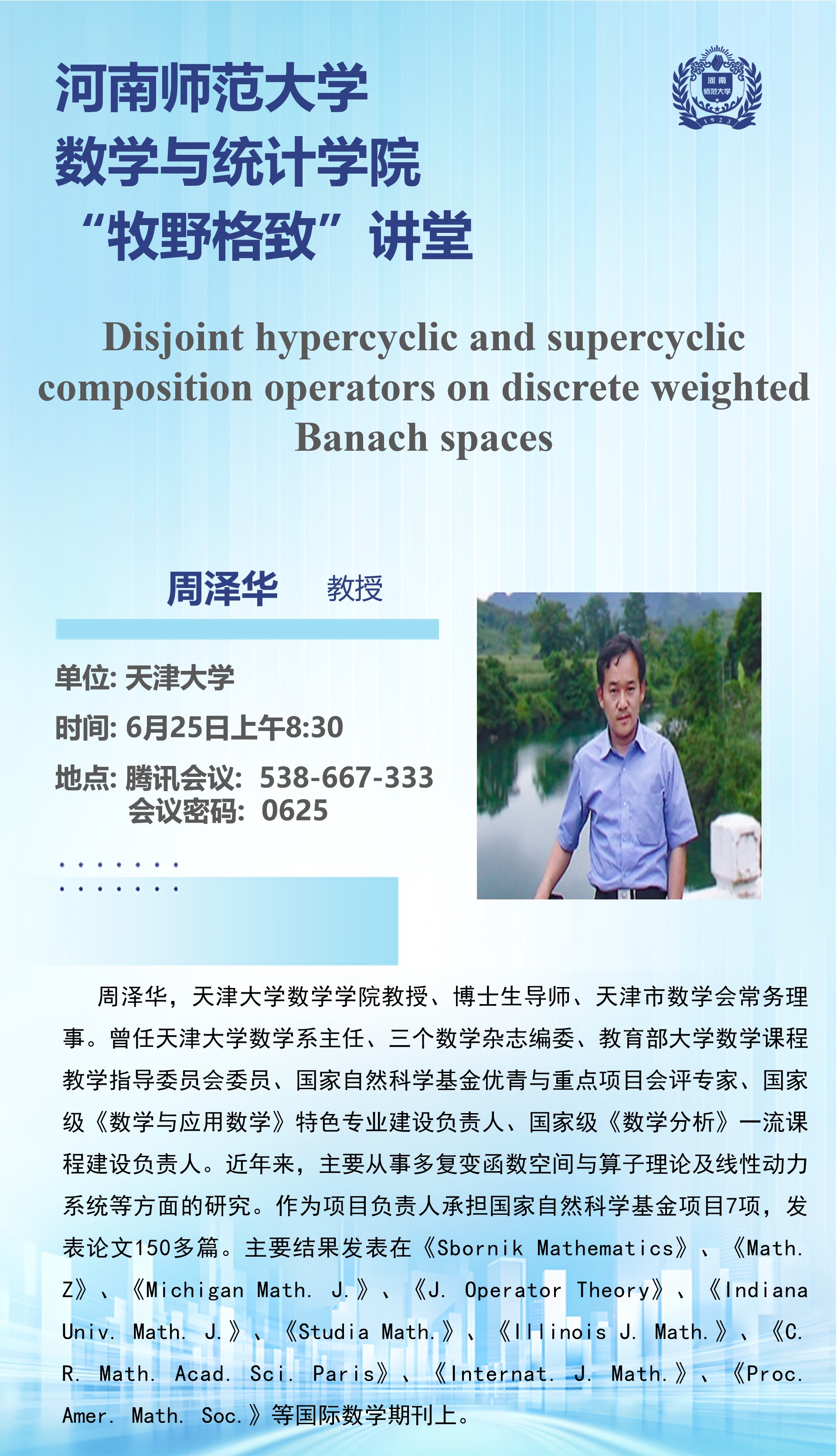 天津大学周泽华教授将应邀做客“牧野格致”讲堂