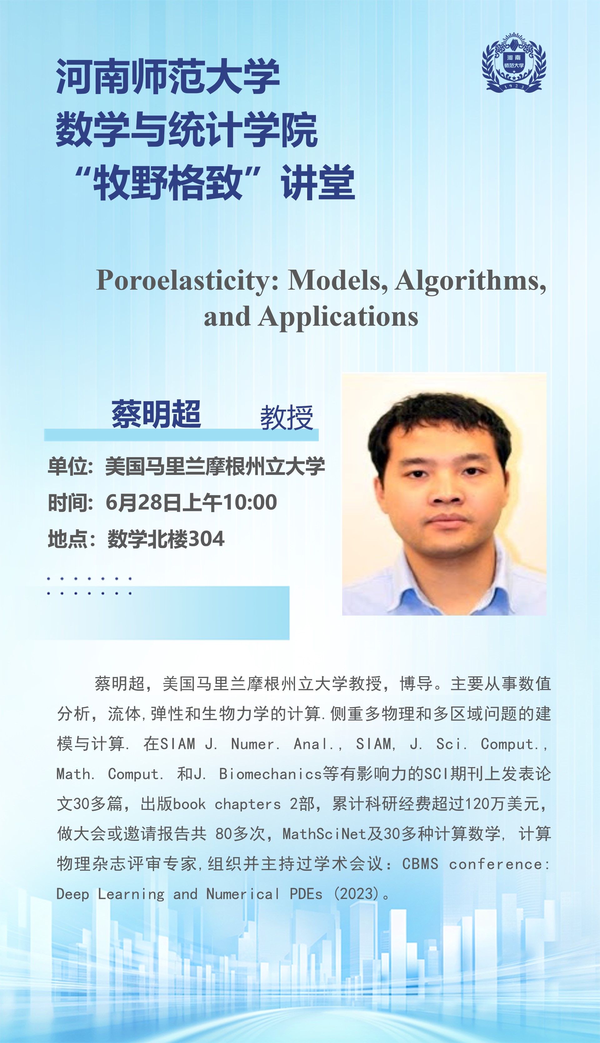 美国马里兰摩根州立大学蔡明超教授将应邀做客“牧野格致”讲堂
