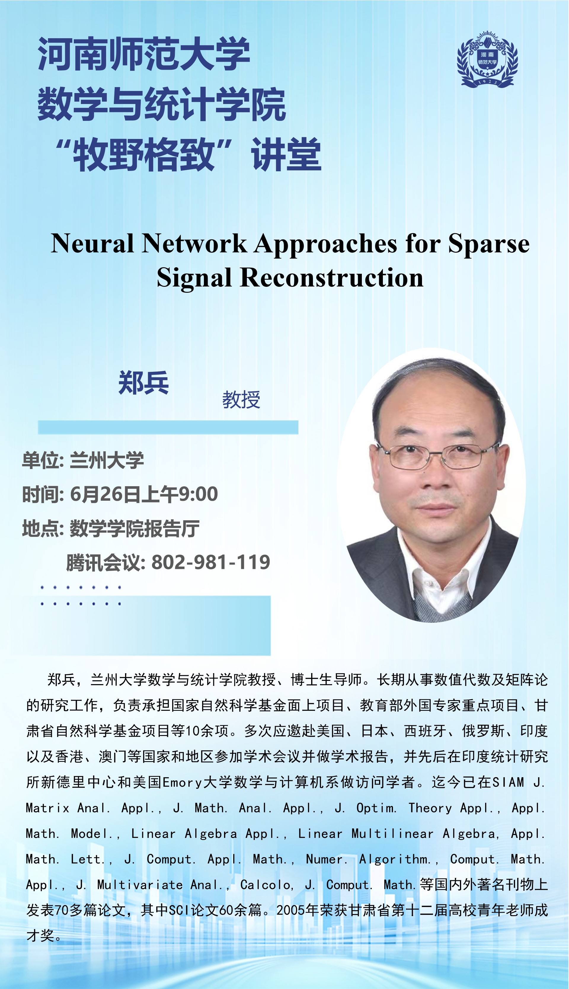 兰州大学郑兵教授将应邀做客“牧野格致”讲堂