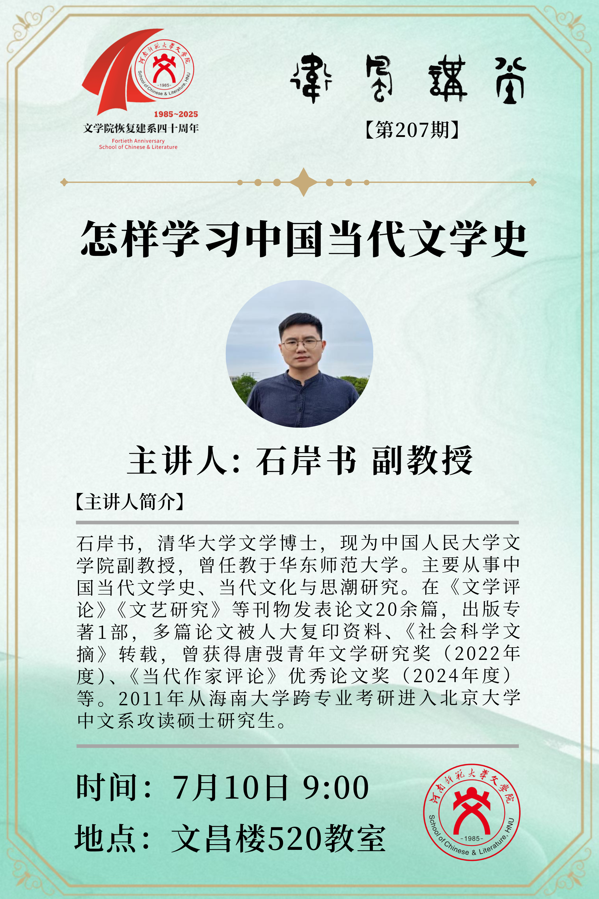 中国人民大学石岸书副教授将应邀做客“卫风讲堂”