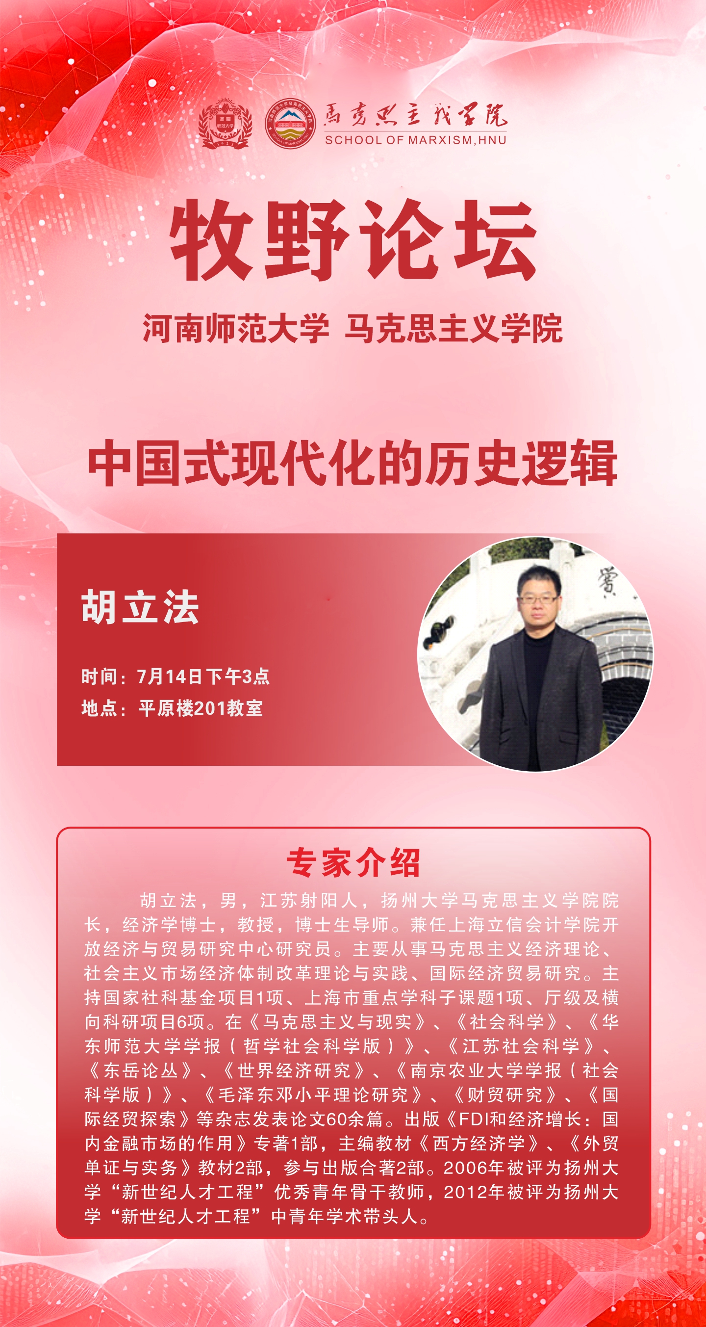 扬州大学胡立法教授将应邀做客“牧野论坛”