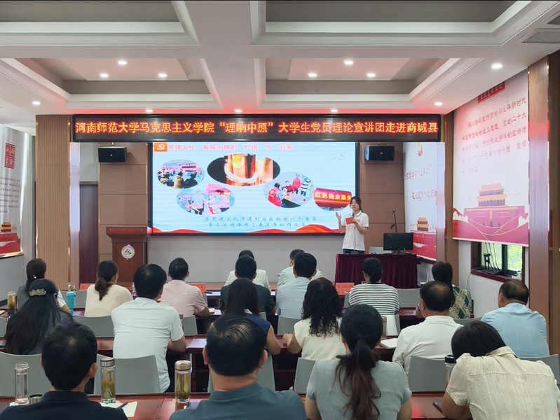 为深入贯彻习近平总书记在河南考察时重要讲话精神,落实校地结对帮扶工作部署,7月17日,马克思主义学院师生赴信阳市商城县开展党建引领基层高效能治理主题理论宣讲。商城县委宣传部常务副部长夏涛、马克思主义学院相关负责人、马克思主义学院大学生党员宣讲团师生代表以及商城县赤城街道、鲇鱼山街道分管领导、村(社区)党支部书记40余人参加活动。