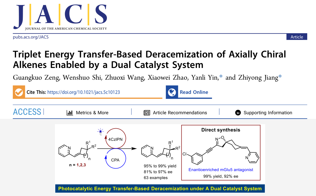 近日,我校江智勇教授研究团队在国际化学期刊Journal of the American Chemical Society发表了题为Triplet Energy Transfer-Based Deracemization of Axially Chiral Alkenes Enabled by a Dual Catalyst System的研究论文。博士后曾广阔为第一作者,青年教师尹艳丽博士和江智勇教授为通讯作者,伟德官网下载苹果版为第一作者单位。