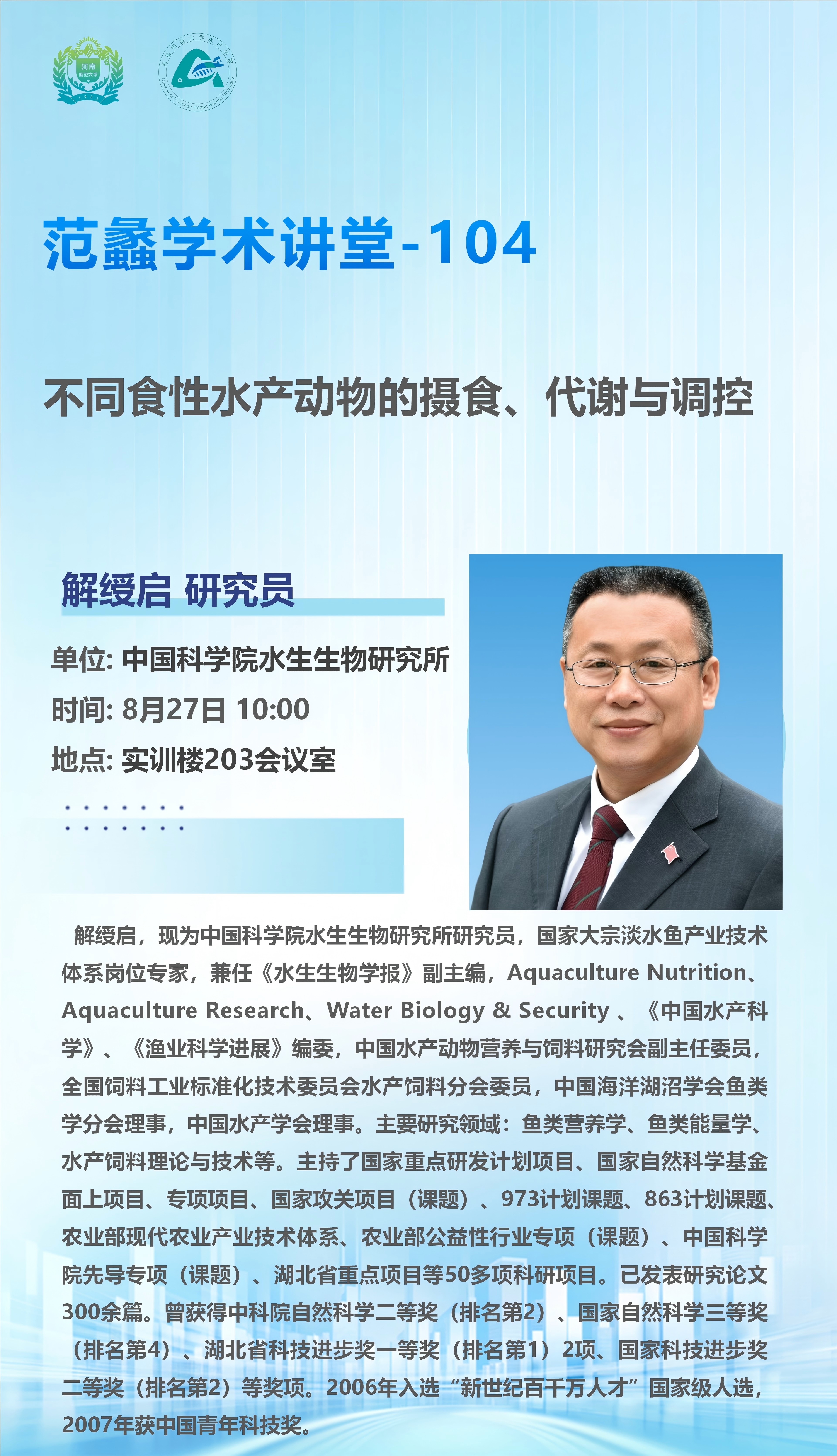 中国科学院水生生物研究所解绶启研究员将应邀做客“范蠡学术讲堂”
