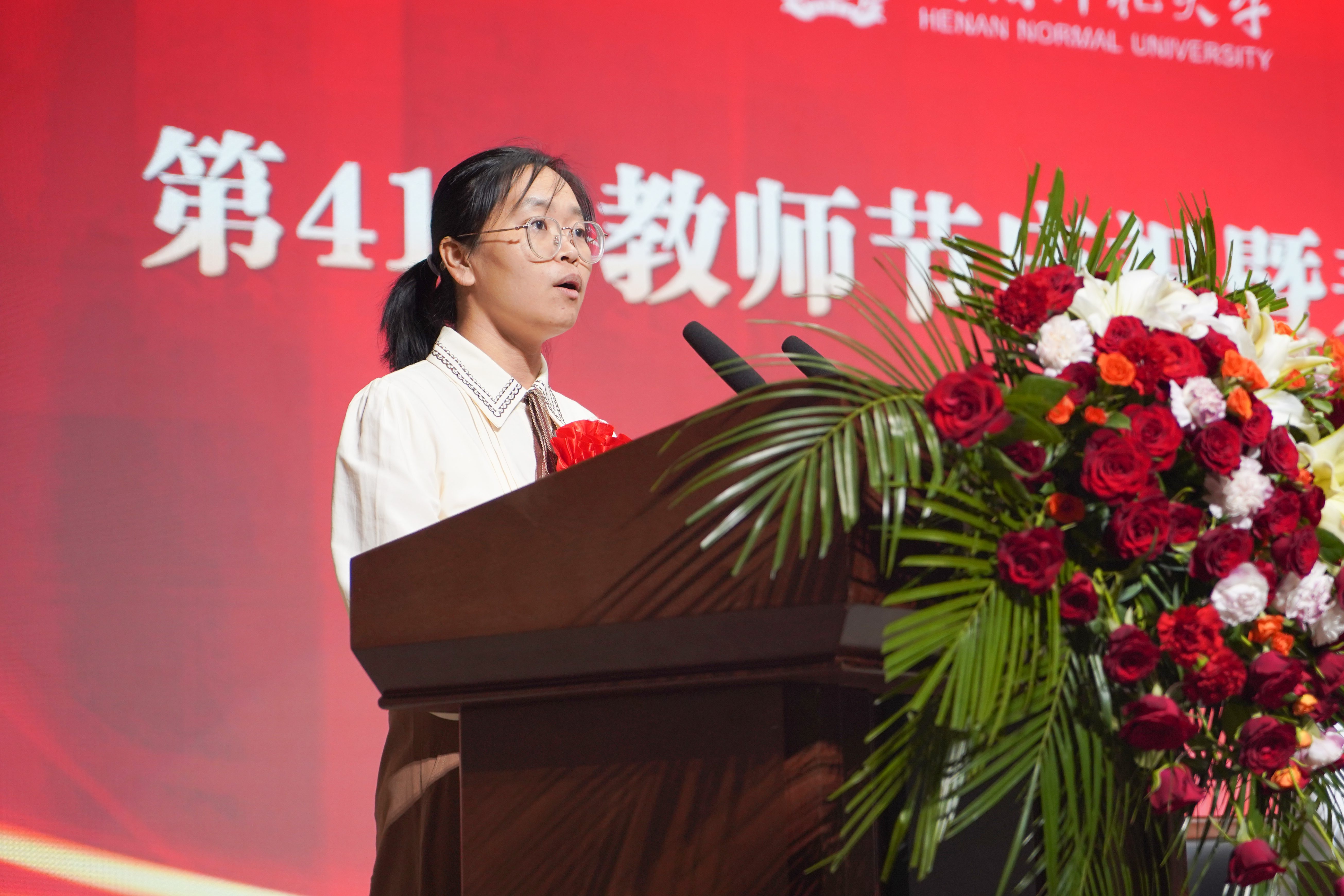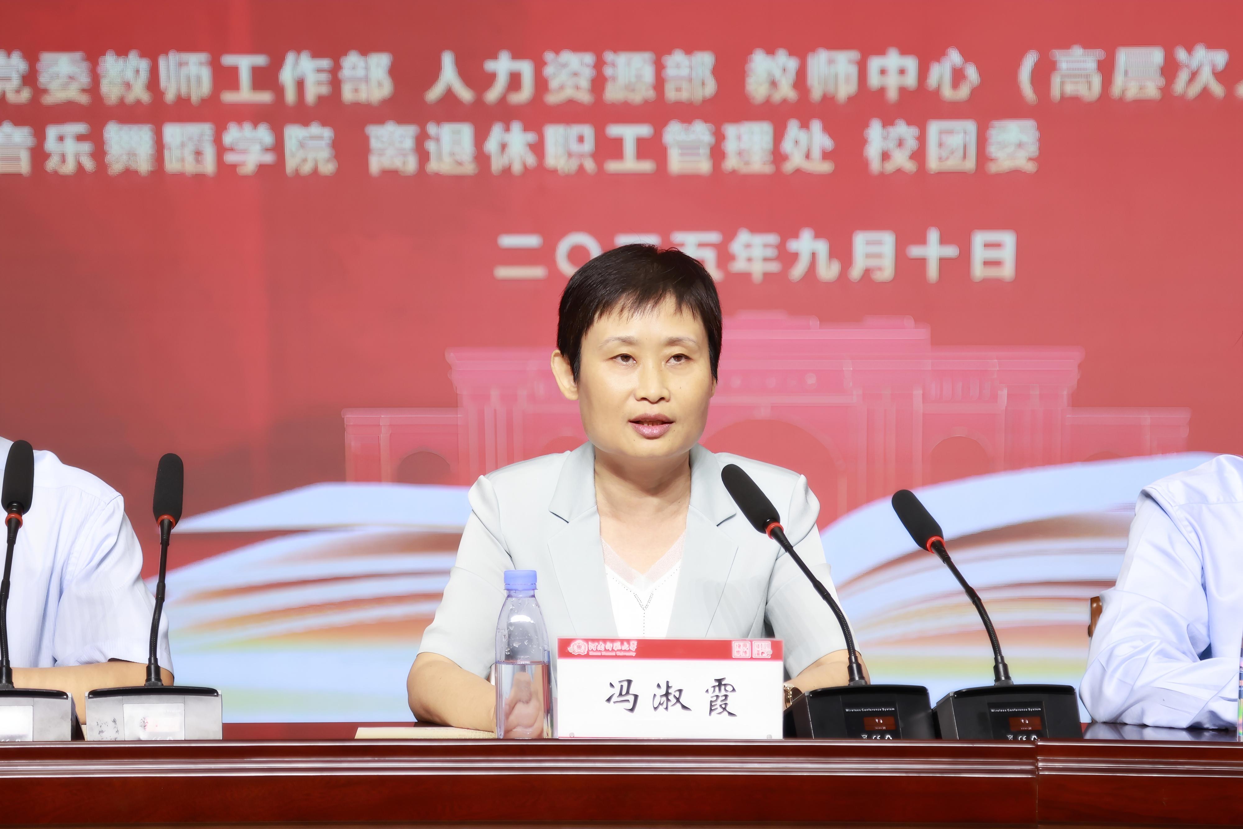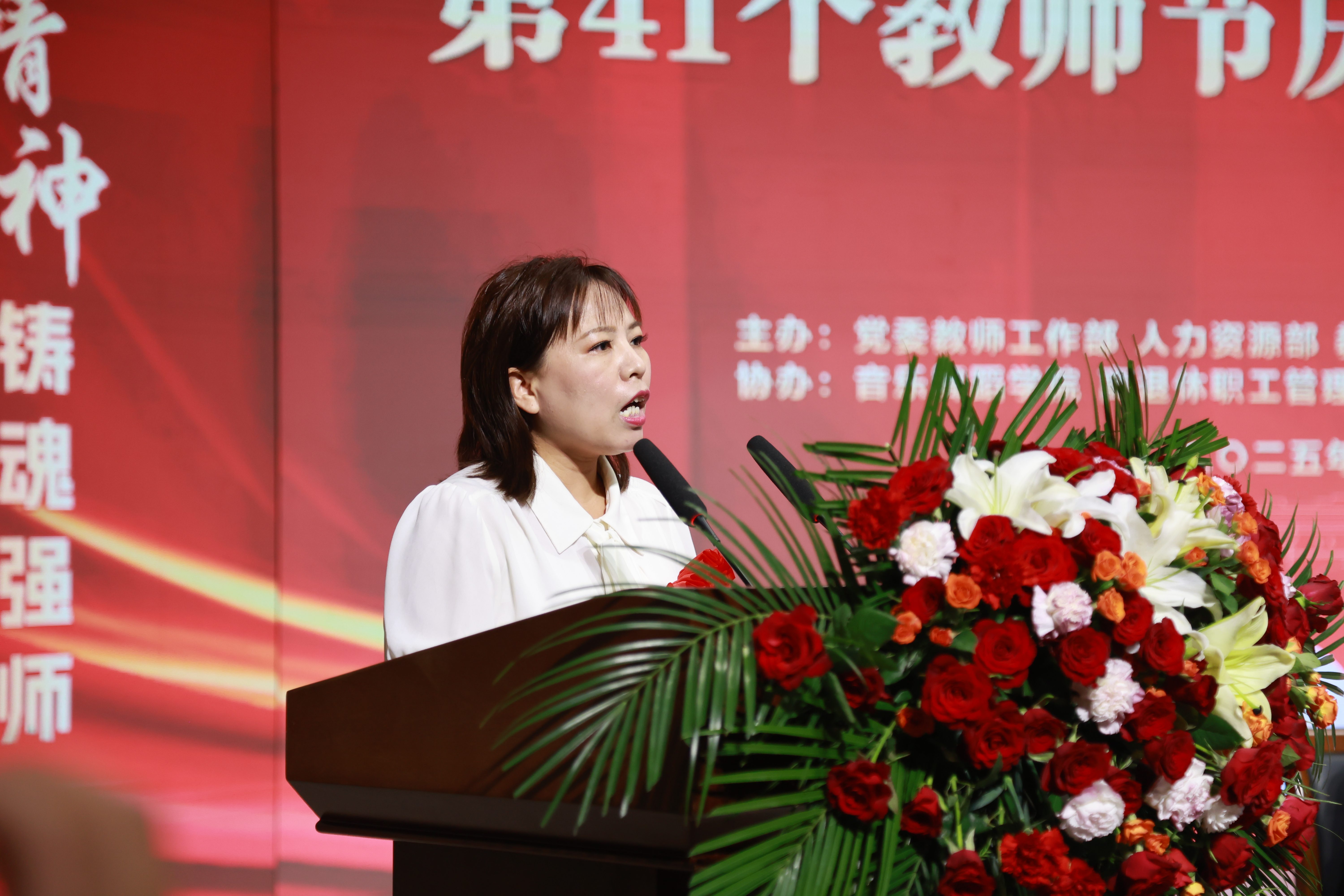 校党委书记冯淑霞向全校教职工致以节日的问候与祝福。她围绕教师节主题,向全体教师提出三点希望和要求。一是争做有理想、弘大道的信仰之师。广大教师要做到理想信念坚定,忠诚党和人民的教育事业,坚定对马克思主义和共产主义的信仰;秉持传道弘业的追求,筑牢文化自信的精神基石,引导学生心怀“国之大者”、勇担强国使命。二是争做有智慧、善创新的躬耕之师。要密切关注教育前沿理论和实践,教育引导学生学会独立思考和深度思考,培养创造性思维和创新精神;要始终秉持追求卓越、追求长远、追求原创的态度,争做新技术的发明者,新规律的发现者,新领域的拓荒者。三是争做情怀深、肯奉献的仁爱之师。广大教师要淡泊名利、无私奉献、甘为人梯,将言传与身教相结合,做“经师”和“人师”的统一者;要把对党和国家的挚爱、对教育的热爱、对学生的关爱融为一体,用爱心铺就学生成才之路,成为党和人民满意、学生真心喜爱的好老师。