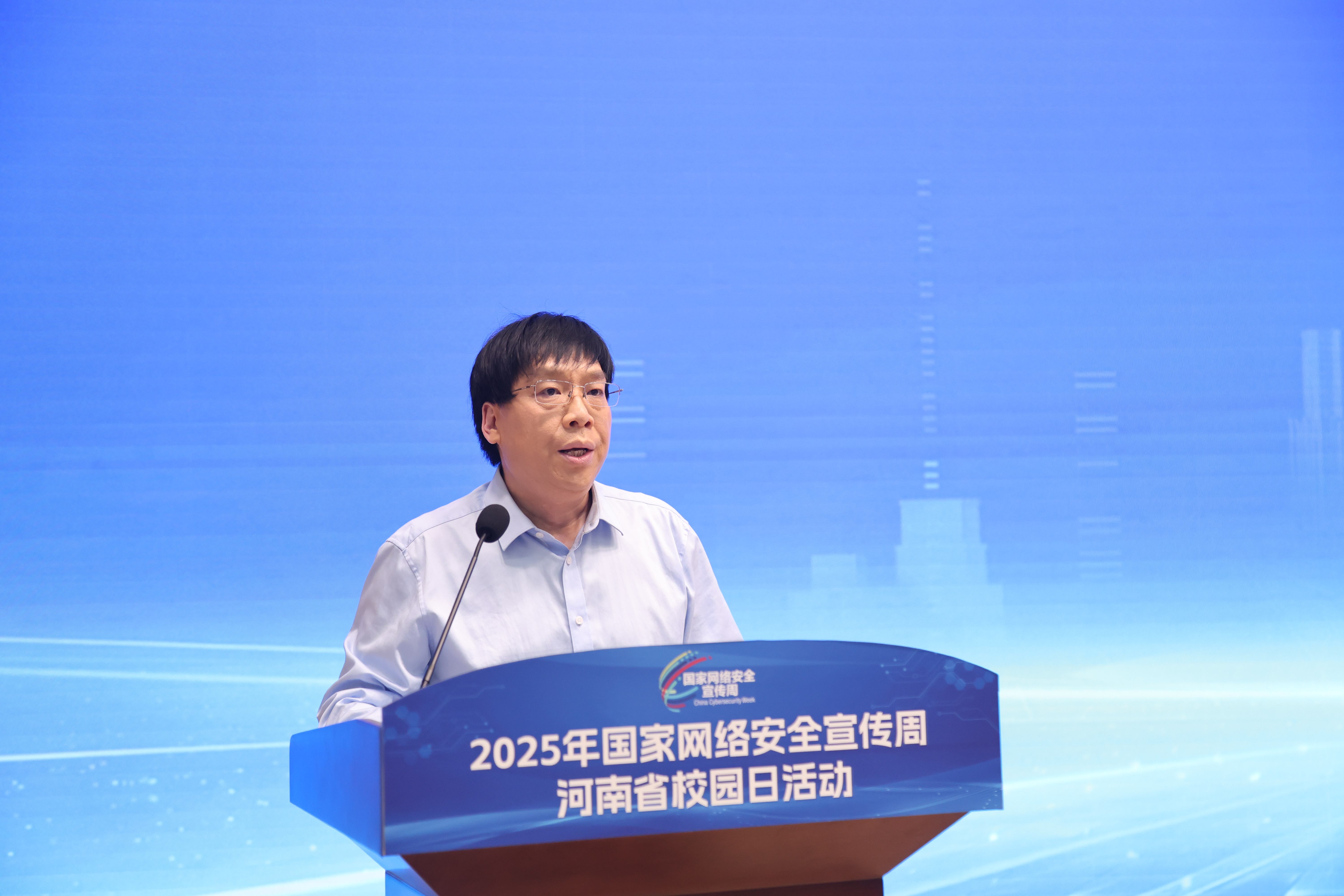 9月16日上午,2025年国家网络安全宣传周河南省校园日活动启动仪式在我校求真楼5楼西报告厅举行。省教育厅二级巡视员聂世忠,省教育厅副总督学、一级调研员方韬,校长郭海明、校党委副书记秦法跃出席活动。驻新高校师生代表、我校相关职能部门和学院负责人、师生代表参加,全省教育系统干部师生线上同步观看直播。活动由秦法跃主持。