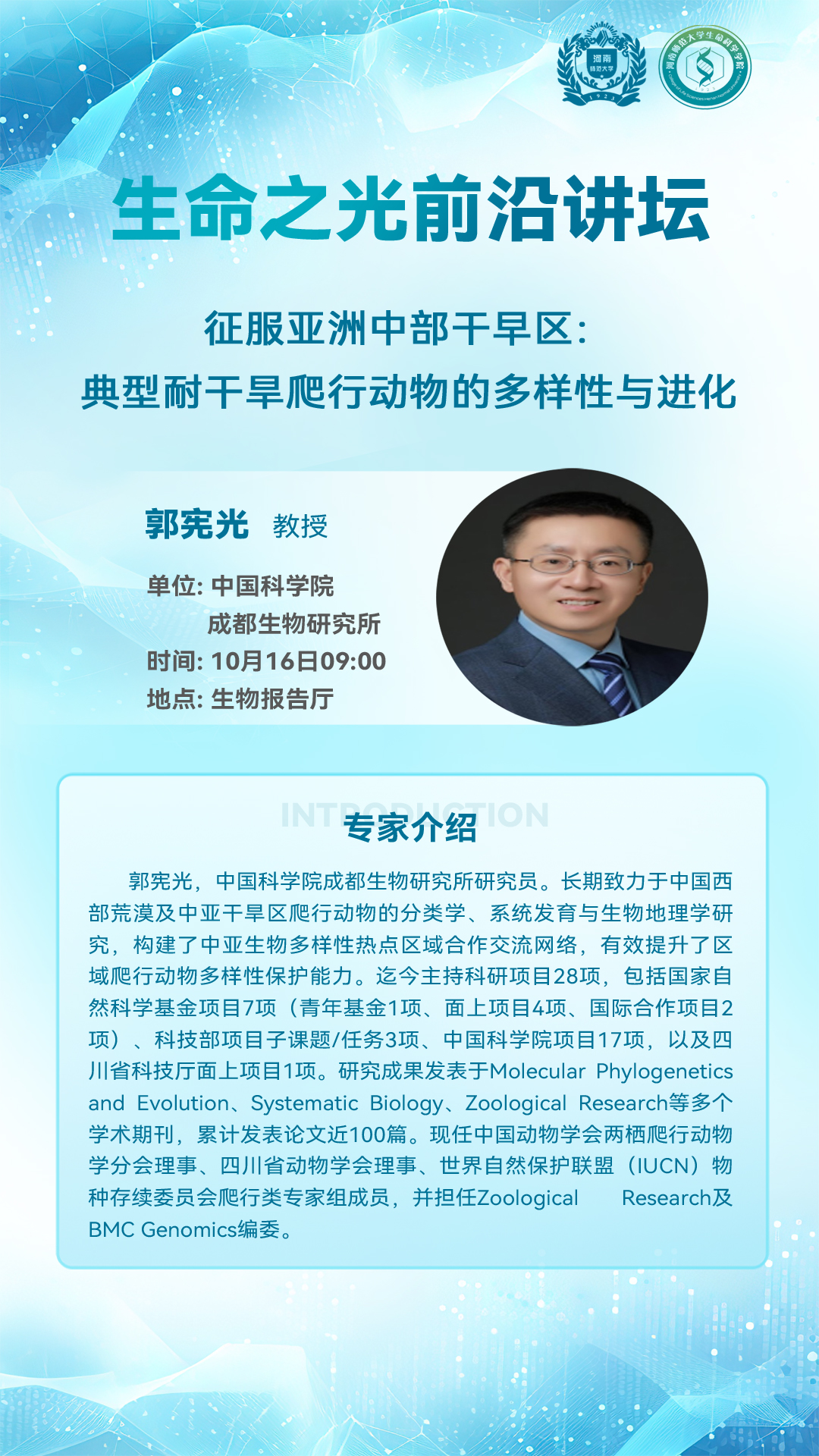 中国科学院成都生物研究所郭宪光研究员将应邀做客“生命之光”前沿讲坛