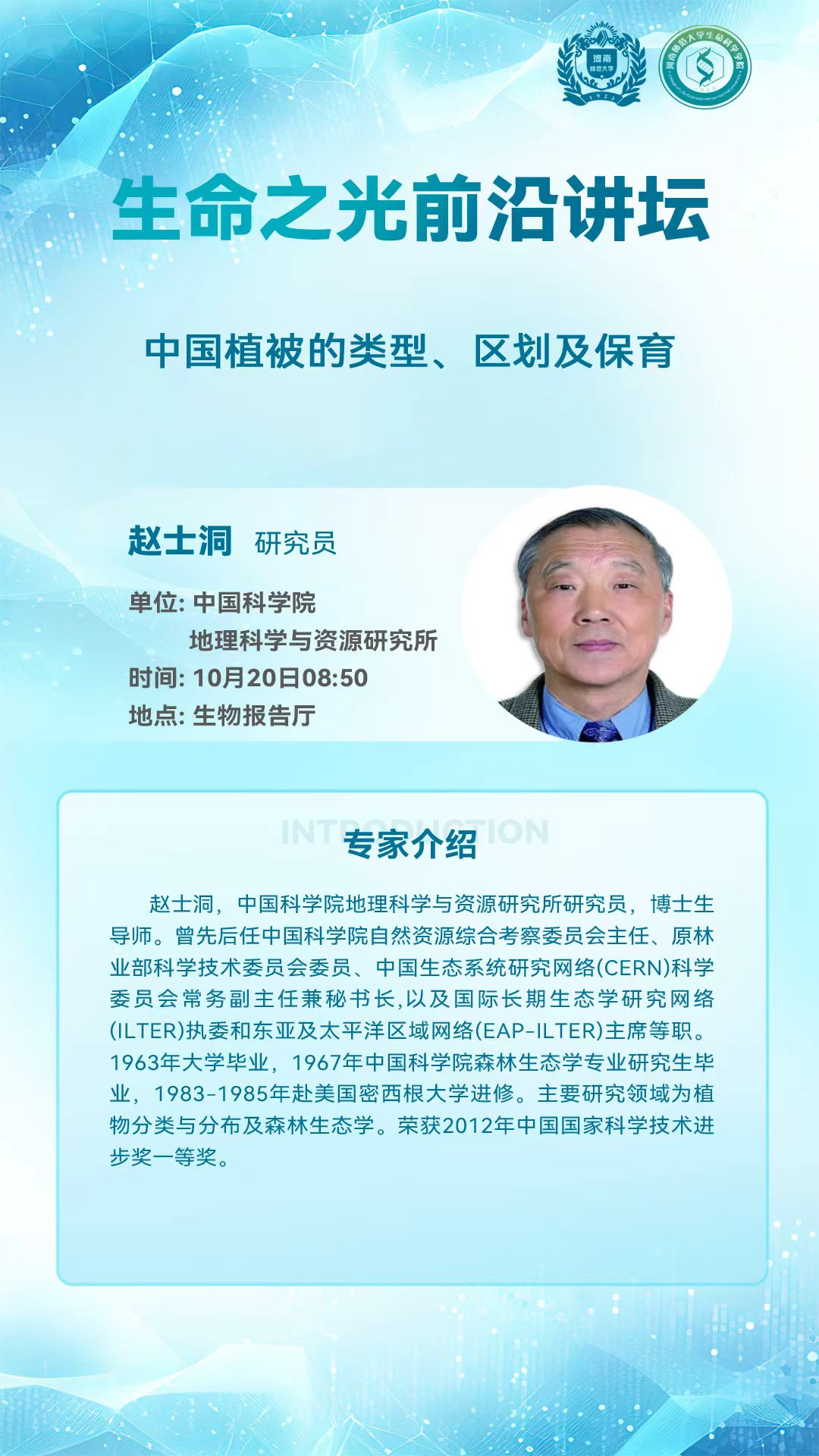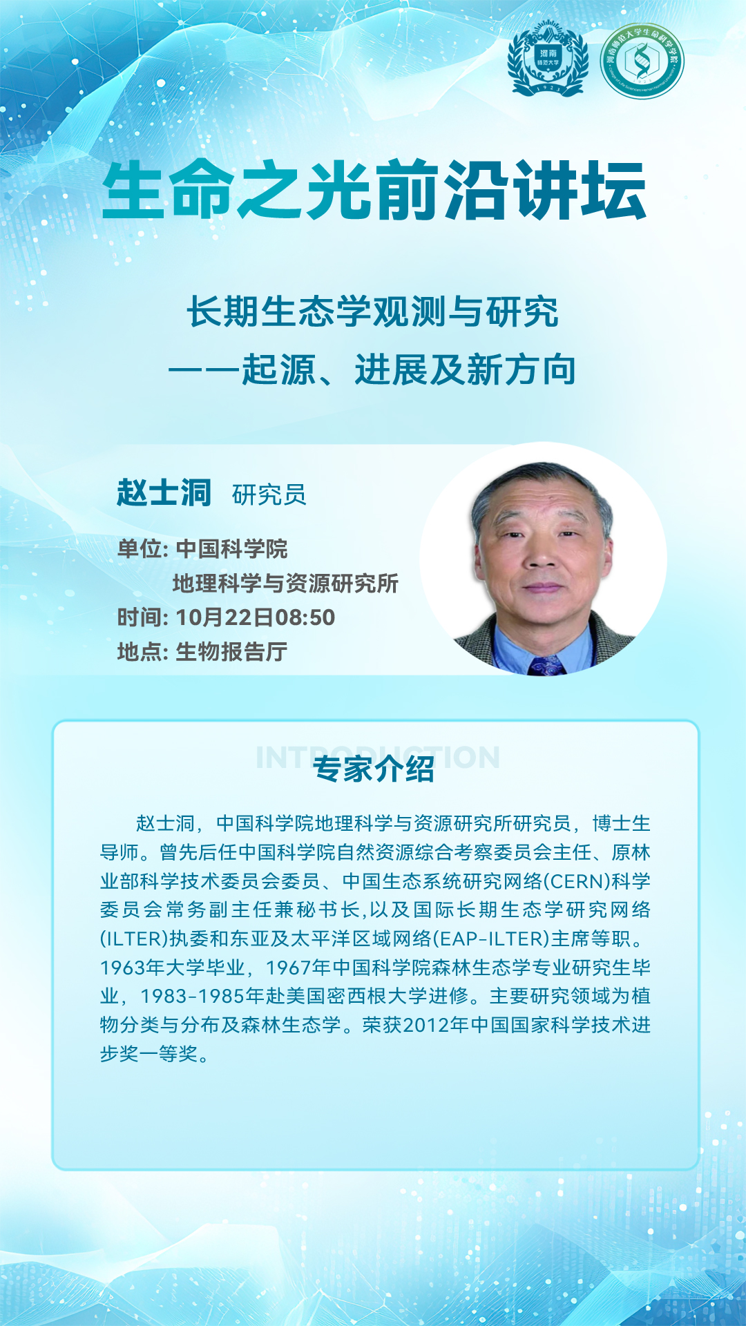 中国科学院地理科学与资源研究所赵士洞研究员将应邀做客“生命之光”前沿论坛