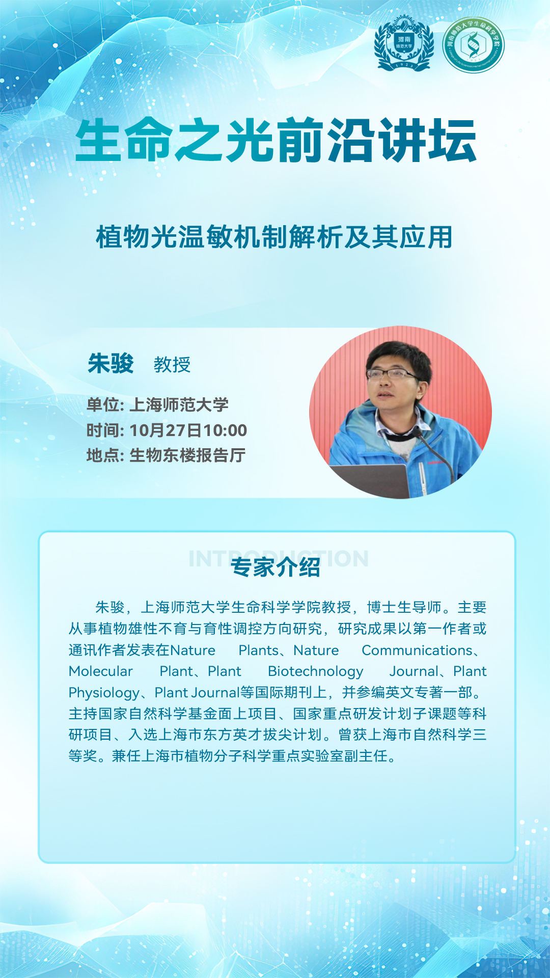 上海师范大学朱骏教授将应邀做客“生命之光”前沿讲坛