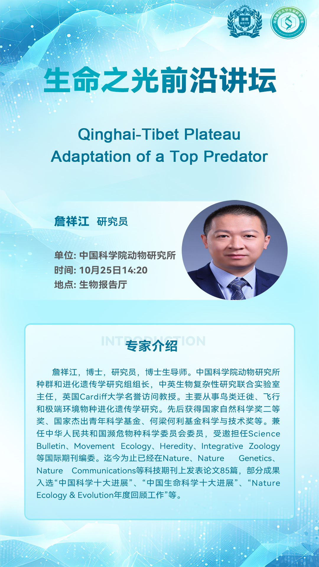 中国科学院动物研究所詹祥江研究员将应邀做客“生命之光“前沿讲坛