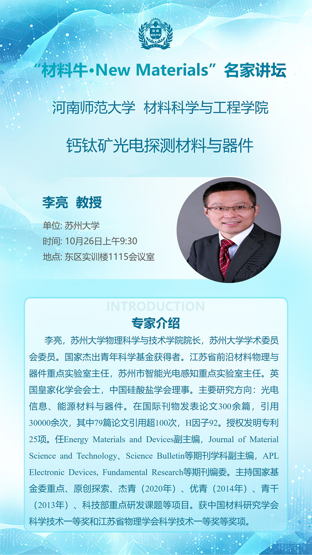 苏州大学李亮教授将应邀做客“材料牛·New Materials”名家讲坛