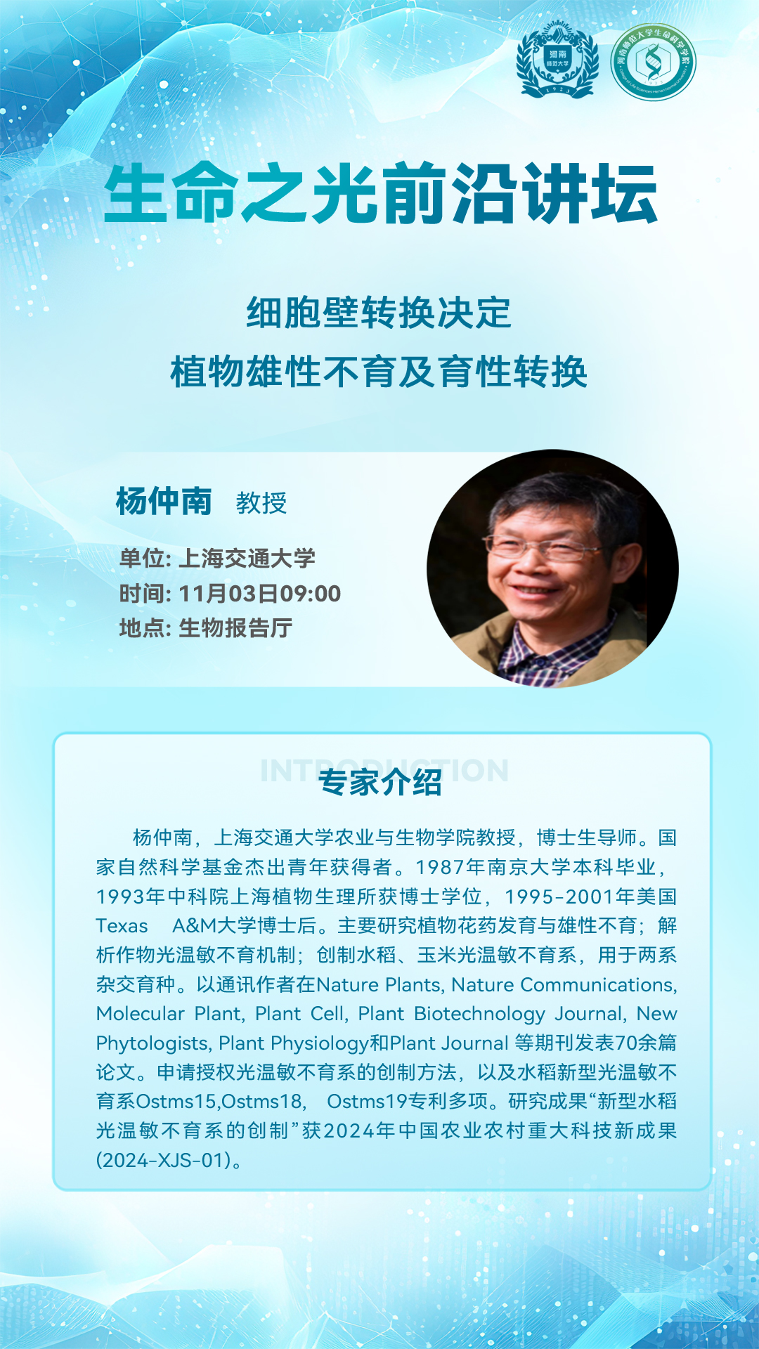 上海交通大学杨仲南教授将应邀做客“生命之光”前沿讲坛