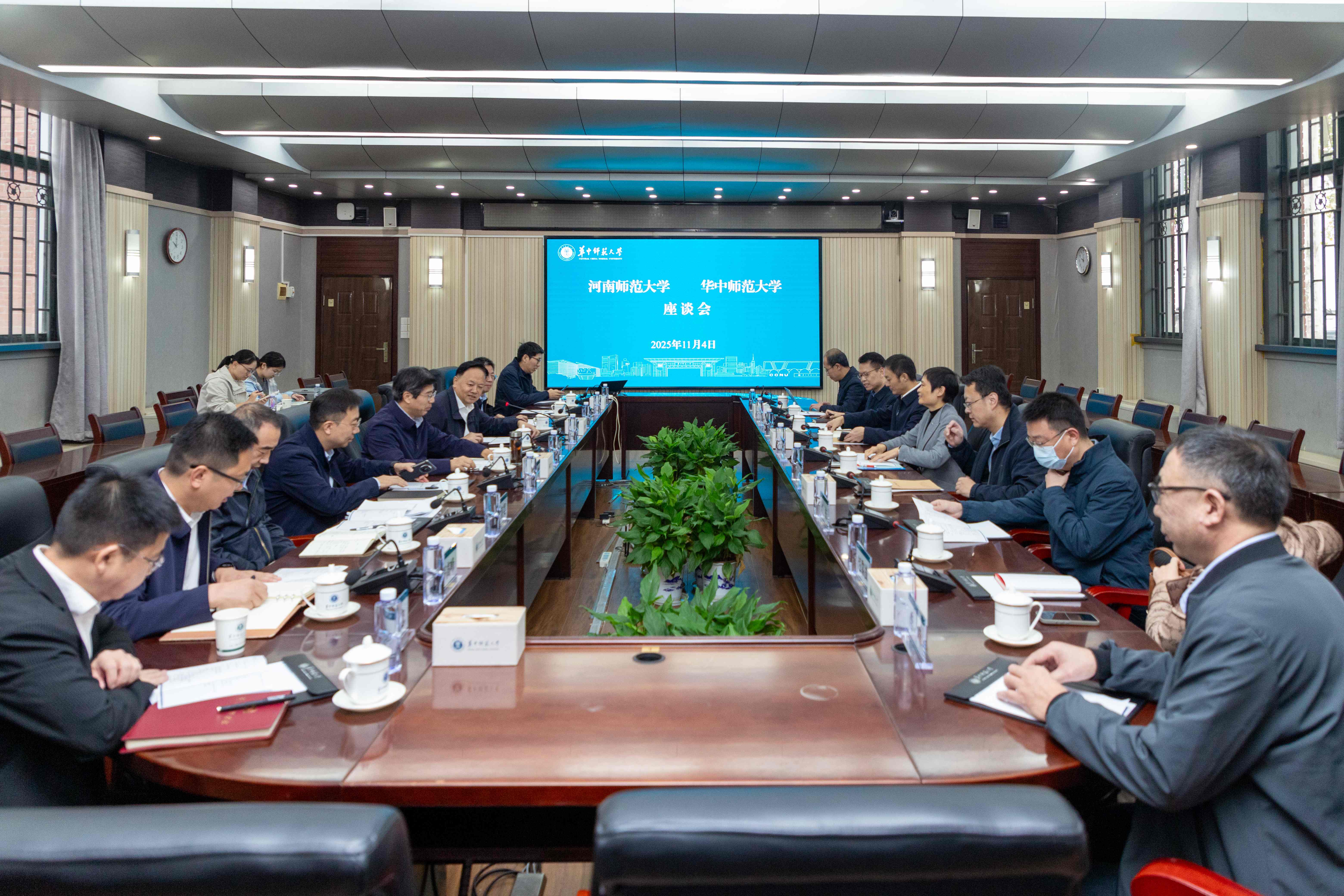 11月4日,我校赴华中师范大学开展调研交流。校党委书记冯淑霞,党委常委、副校长苗雨,华中师范大学校长彭双阶、副校长周鹏程出席座谈会。我校党政办公室、人力资源部、发展规划与学科建设处、社科处、物理学院、历史文化学院相关负责人,华中师范大学人事处、发展规划处、社科处、国内合作与培训管理处、历史文化学院、物理科学与技术学院等部门负责人参加。座谈会由周鹏程主持。