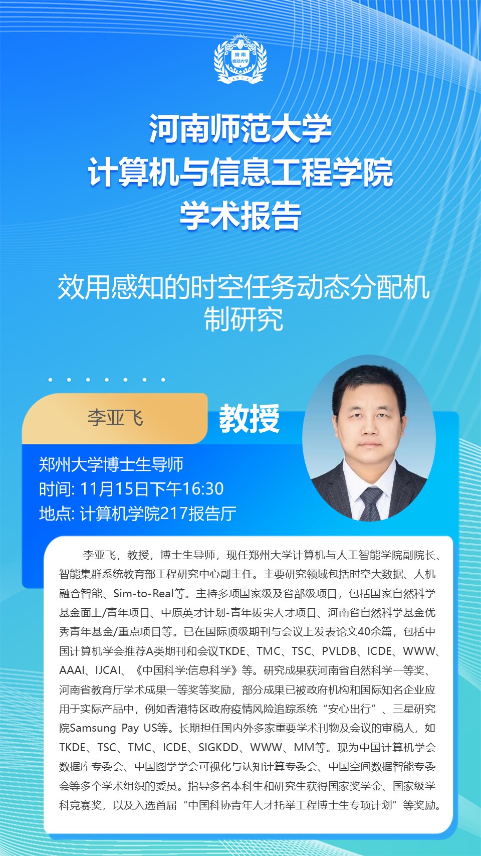 郑州大学李亚飞教授将应邀做客“智能科学”讲坛