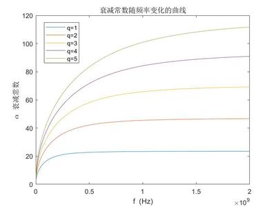 相位常数为β,在给定ε、μ的情况下,观察衰减常数随频率的变化,并设置不同的电导率q值进行比对