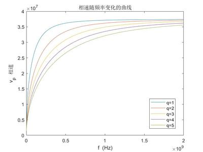 相速是电磁波等相位面的传播速度。在媒质中,单一频率的电磁波沿z方向传播的相速是否与频率有关取决于相位常数β,在给定ε、μ的情况下,观察衰减常数随频率的变化,并设置不同的电导率q值进行比对