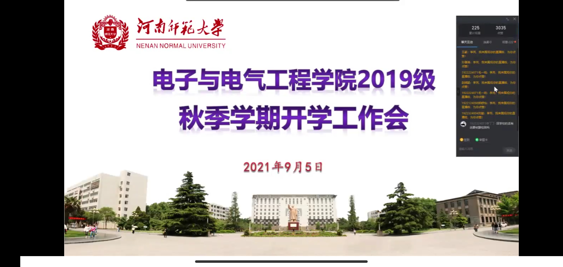 9月5日上午,我校2021年秋季学期“开学第一课”在线上正式开讲,辅导员李芮老师组织学生在线上准时收到。为进一步引导学生学习“开学第一课”内容,保障新学期线上教学活动的顺利开展,我院2019级本科生于9月5日晚通过“钉钉”在线方式召开主题班会,会议由李芮老师主持。