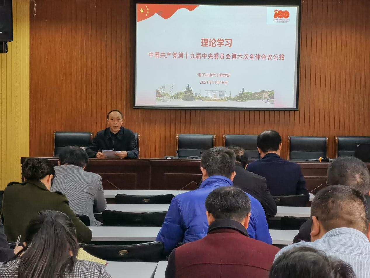 11月16日下午,我院在学院教工之家集中学习党的十九届六中全会精神,全体教职工参加,会议由学院党委书记万运京主持。