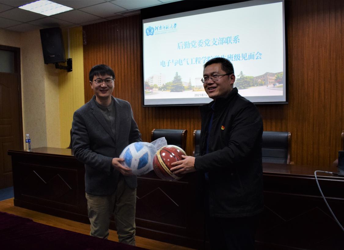 最后,为丰富学生们的课外运动,使学生养成健康强壮的体魄,感谢同学们的建言献策,后勤党委为2019级电气班赠送篮球、排球、羽毛球等体育用品。