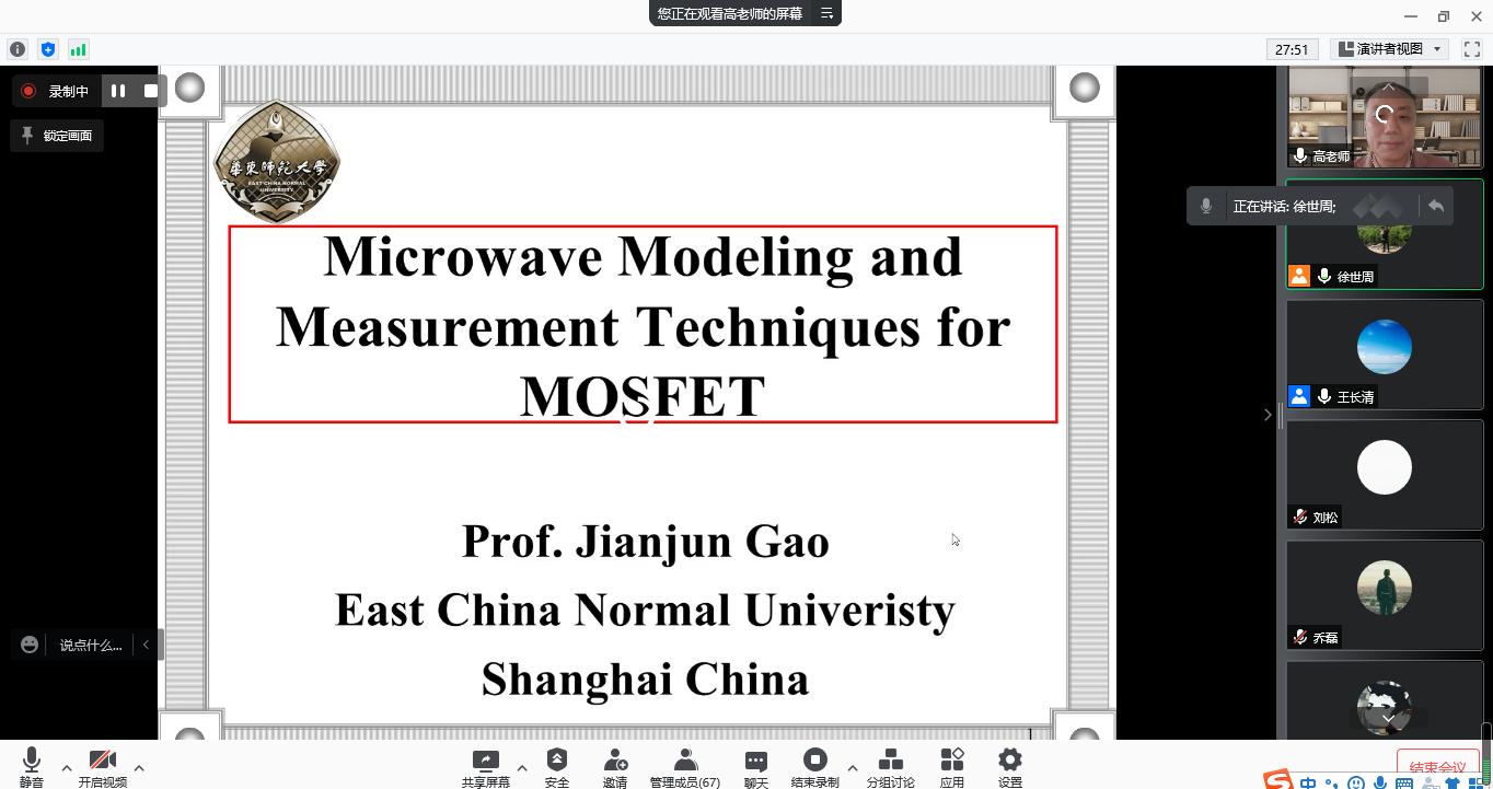 高建军教授首先简要介绍了华东师范大学微波学科发展历史、微波研究团队及研发平台,并就现阶段国内外研究现状进行综述;其次介绍MOSFET的基本理论,包括基本原理、器件建模、设计手段、应用水平等;最后对该领域的研究热点进行分析。该讲解有助于与会人员加深对MOSFET研究方法和应用领域的认识,提升从事该研究领域的研究生的认知,拓宽青年教师未来在该领域进行科研工作的思维方式与方法。