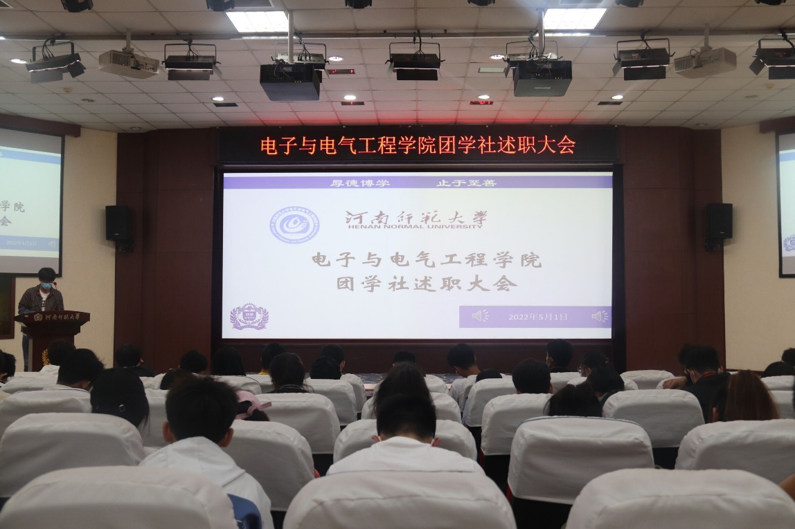 为提高我院团学社学生干部的工作水准,回顾前期工作情况,总结工作经验不足,推动我院团学社工作的有序开展,5月1日上午,我院于物理北楼三楼报告厅举行电子与电气工程学院团学社述职大会。本次会议由学生会主席王涵主持,院团委副书记付康康出席,团学社全体学生参加。