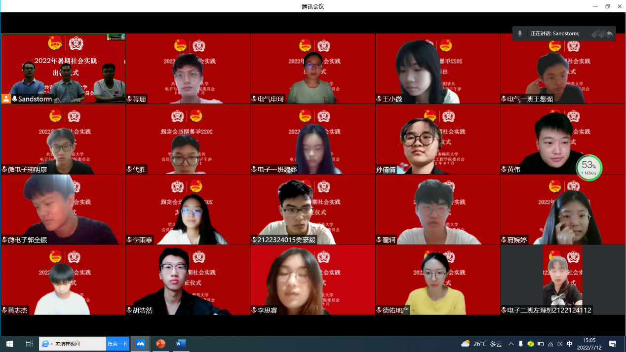 喜迎二十大,永远跟党走,奋进新征程。为进一步推进我院暑期“三下乡”实践活动工作部署,引导和帮助广大青年学生在社会课堂中受教育、长才干、作贡献。7月12日下午,我院用腾讯会议举行暑期“三下乡”社会实践活动出征仪式,学院党委副书记邓晓刚、团委副书记付康康、指导老师及全体实践团队队员参加,仪式由付康康主持。