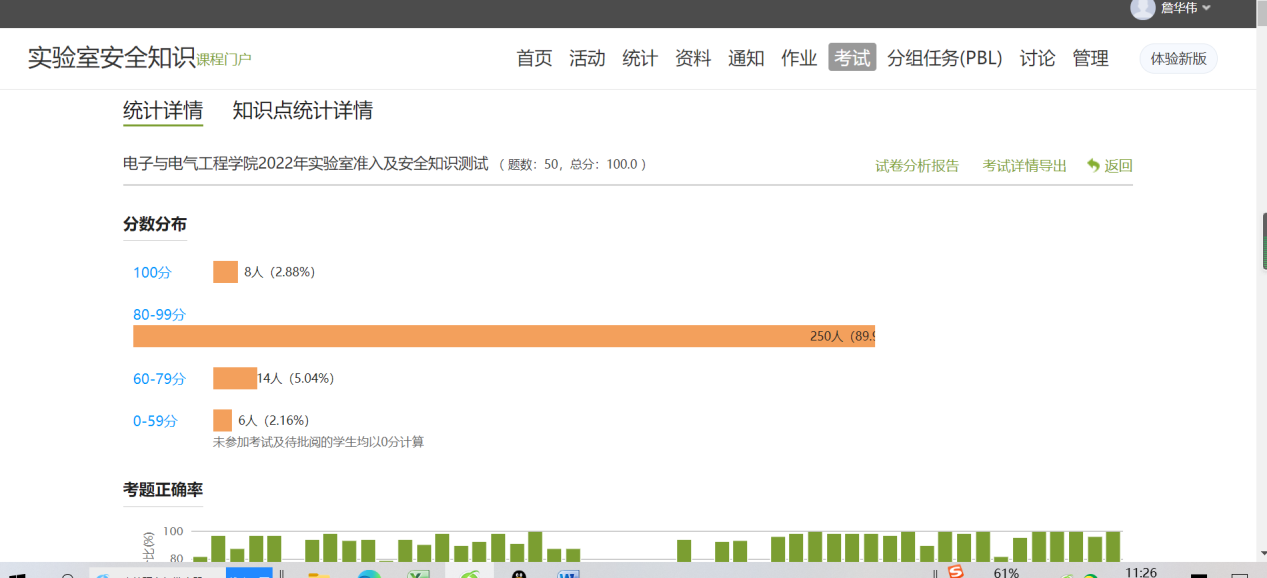 为强化安全责任意识,建立实验室安全管理的第一道防护栏,结合工作实际,在学院实验室安全工作领导小组高度重视和具体指导下,根据《教育部办公厅关于开展加强高校实验室安全专项行动的通知》、《关于加强高校实验室安全工作的意见》(教技函(2019)36 号)等文件精神,针对实验室消防用电安全、危险品及特种设备安全、常见安全隐患、应急预案、环境保护等方面,10月7日,我院在超星学习通上对2022级全体本科生和研究生进行实验室准入及安全知识测试,一次性通过率达98.2%以上。