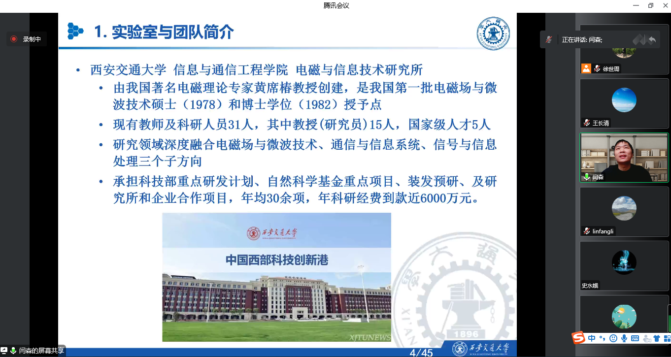 应我院邀请,西安交通大学闫森教授(博导)于10月29日上午9点在腾讯会议平台上作了题为《衣物集成的多功能可穿戴天线设计》的专题学术讲座。学院负责人、师生代表100余人参加讲座。讲座由院长王长清主持。