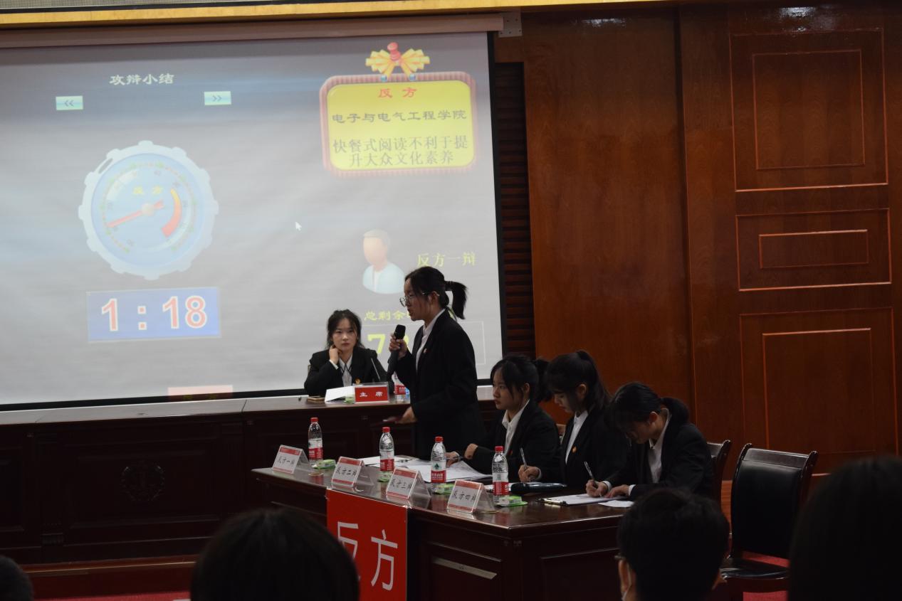 本场比赛正反方围绕着“快餐式阅读是否有利于提升大众文化素养”展开辩论。双方一辩具有高度概括性的陈述为本场辩论开篇陈词。接着双方二辩补充陈词,双方二辩灵活的思维和缜密的逻辑推理,让台下评委眼前一亮。而到了本场最精彩的阶段——自由辩论阶段,面对对方辩友的引经据典,旁征博引,我院辩手们根据当下的调研数据给以反击。辩手们或慷慨陈词,或娓娓道来,旁征博引、据理力争,观点不断碰撞,攻防转换间体现出辩手们缜密的逻辑思维和机敏的反应能力。言之谦谦,辩之有数,说罢千古论今朝。此次辩论赛在你来我往的交锋中加深了双方辩手对辩题的理解,加深了当代青年学子对社会热点的思考。