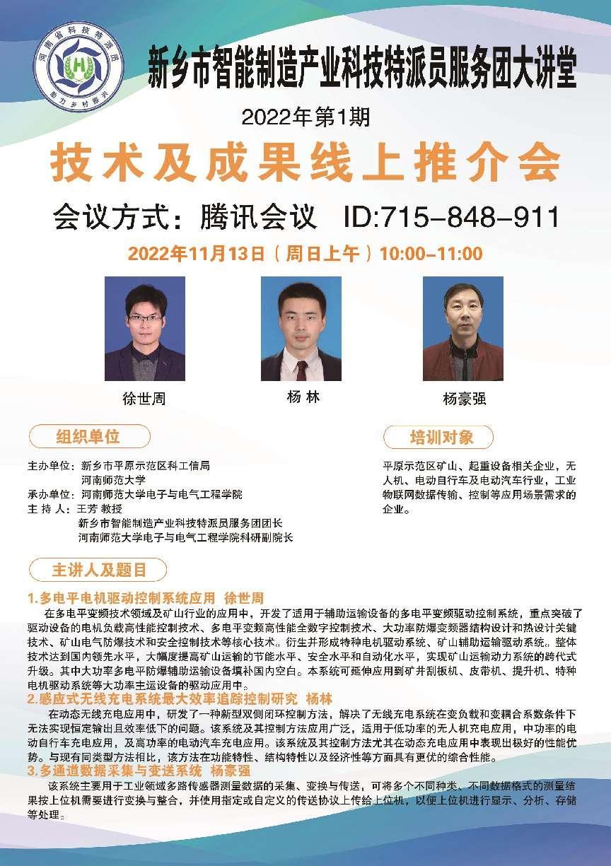 会上由徐世周副教授、杨林副教授、杨豪强工程师三位主讲人分别围绕多电平电机驱动控制、无线充电系统控制,以及多通道数据采集与变送系统,展开了详尽的技术介绍和应用推广,示范区辖区内河南众德新材料有限公司、河南蕴之齐电子科技有限公司、河南鸿鹄新材料有限公司、河南易能电力工程有限公司等30多家企业参加了线上会议,并对技术的细节及成果进行了广泛深入的讨论,并决定将在线下针对具体的应用继续进行实地对接和调研。