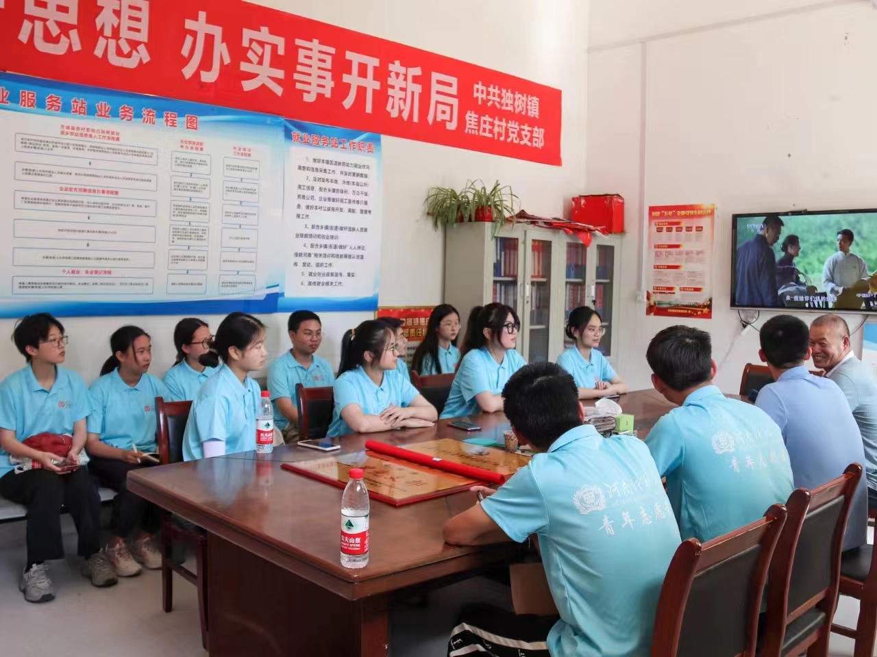 下午,调研团前往独树镇焦庄村。在村委会见到了村支书熊书记,他对调研团的实践活动表示支持,并向队员们介绍了独树镇焦庄村红二十五军的革命故事以及近年来的乡村发展成果。熊书记讲道:“红二十五军先头队伍的成员年龄偏小,大多数只有十六七岁,有些只有十三四岁,很少有成年的军人,也被称为童子军,但战争无情,他们大多牺牲于此战役。”听到这里,大家对这些比自己还小的英雄却承担起这样的责任倍感震撼,表情逐渐凝重,倾耳侧听。