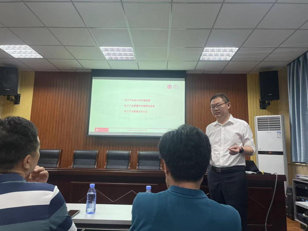李红强总监分享了学生时代的师大趣事,简单介绍了自己的求学工作经历,并重点讲解了市场上电子产品设计的关键流程,以及设计中需要遵守的强制性标准及要通过的认证。随后,与会老师在封装技术温度控制方面与其进行了热烈交流,受益匪浅。