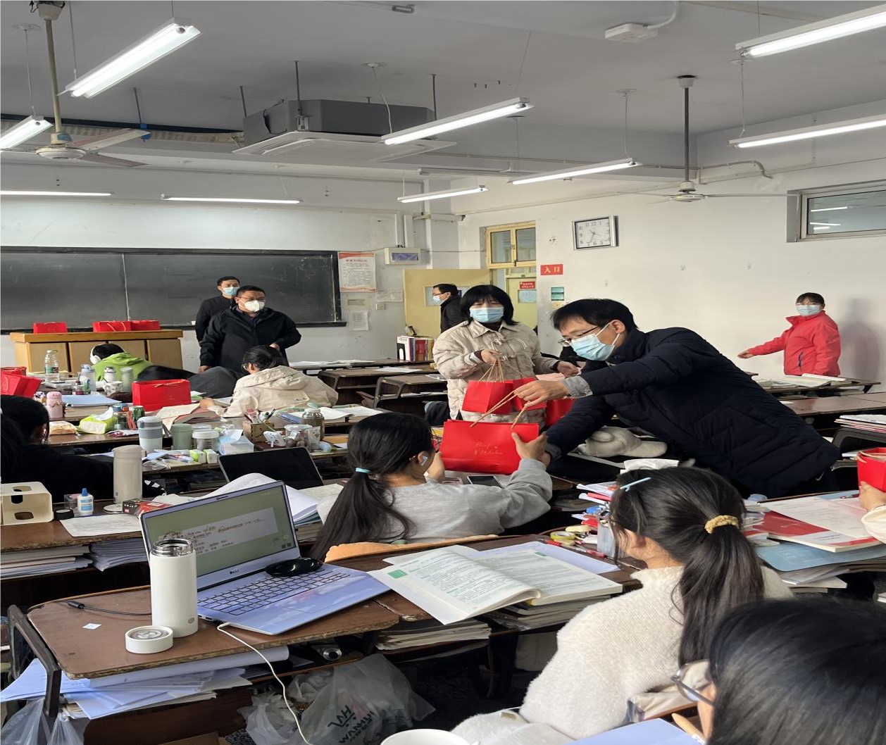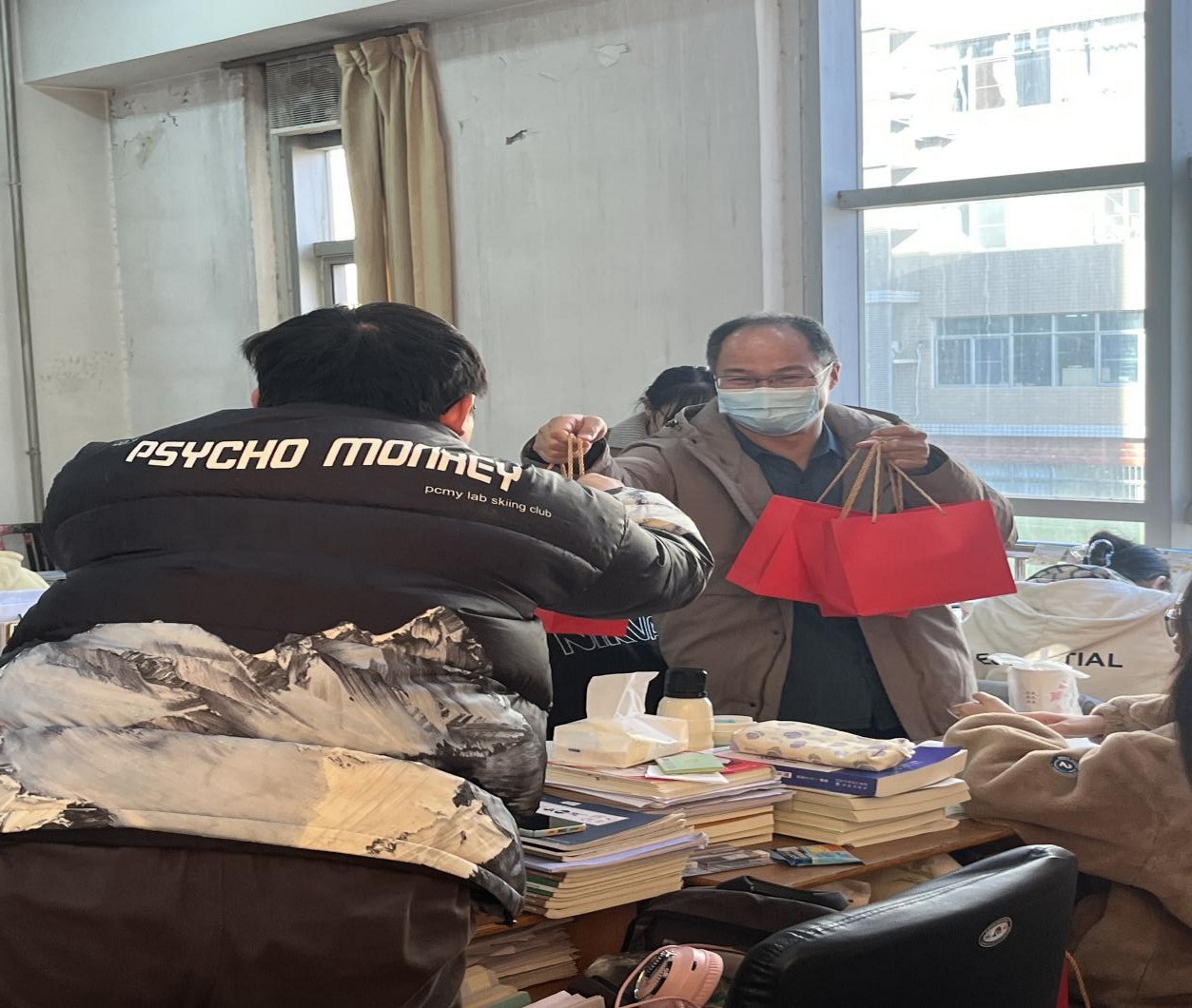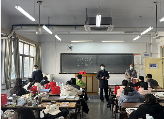 慰问活动中,学院领导老师与同学们进行了亲切交谈,表达了学院的关心和祝福。学院党委书记高飞对同学们备考的精神状态表示肯定,他鼓励大家要坚持到底,不到最后一刻绝不放松,要用积极的态度迎接每一次挑战,用不懈的努力去达成每一个目标,用今天的汗水成就明天的辉煌;院长王长清叮嘱同学们考研倒计时最后一个月一定要做好统筹规划,查漏补缺,补自己的短板,做到有针对性的复习,同时提醒同学们气温骤降,做好保暖;院党委副书记邓晓刚预祝同学们在考研最后的冲刺阶段稳扎稳打,取得优异成绩,超常发挥,成功上岸;最后,高飞在黑板上写下了对同学们的寄语:“坚持到底,就会胜利!”随后,老师们为同学们发放了精心准备的“考研加油包”。