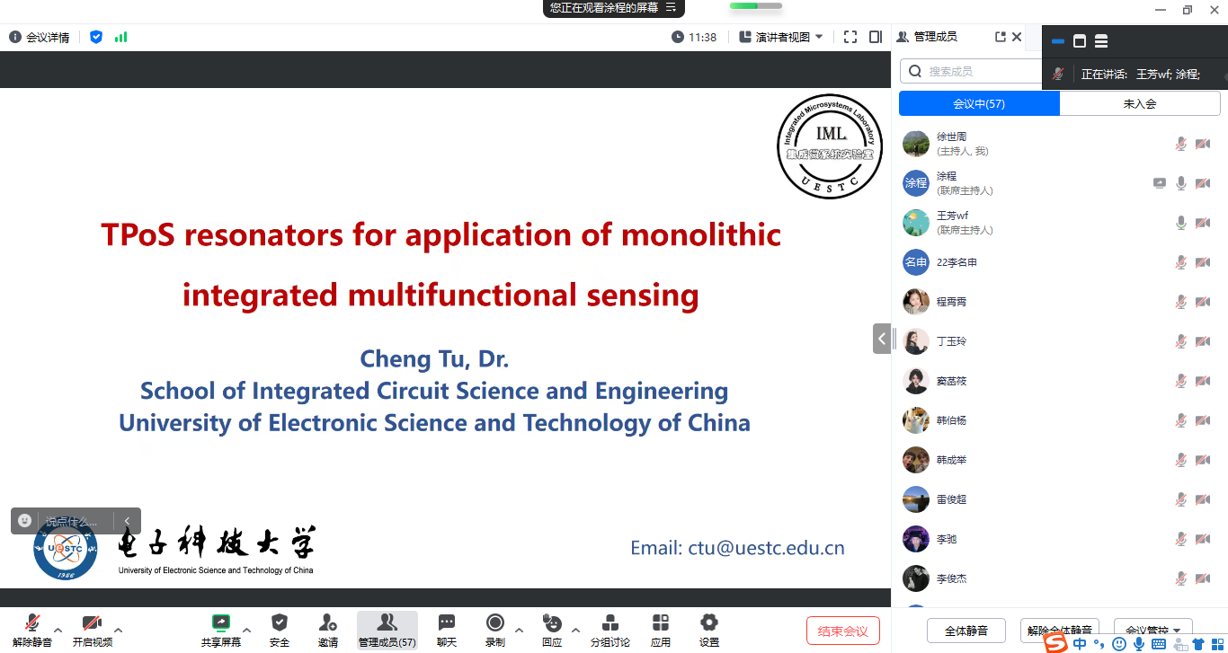 应我院邀请,电子科技大学涂程副研究员(博导)于12月5日下午14:30在腾讯会议平台上作了题为《基于TPoS谐振器的多功能集成传感芯片技术》的专题学术讲座。我院负责人、师生代表100余人参加讲座。讲座由科研副院长王芳主持。