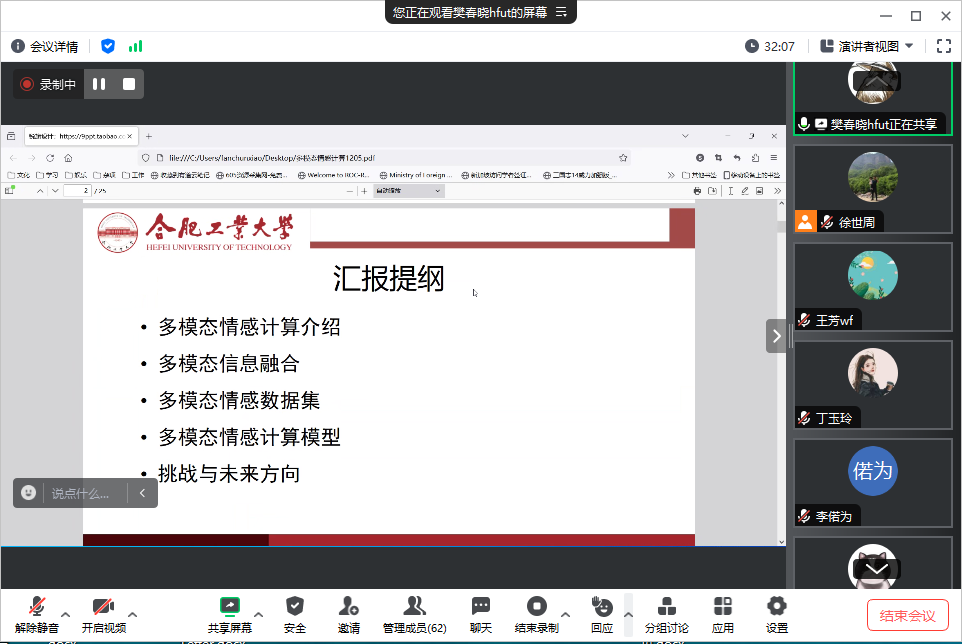 应我院邀请,合肥工业大学樊春晓副教授于12月7日上午9点在腾讯会议平台上作了题为《多模态情感分析的挑战与新进展》的专题学术讲座。我院负责人、师生代表100余人参加讲座。讲座由科研副院长王芳主持。