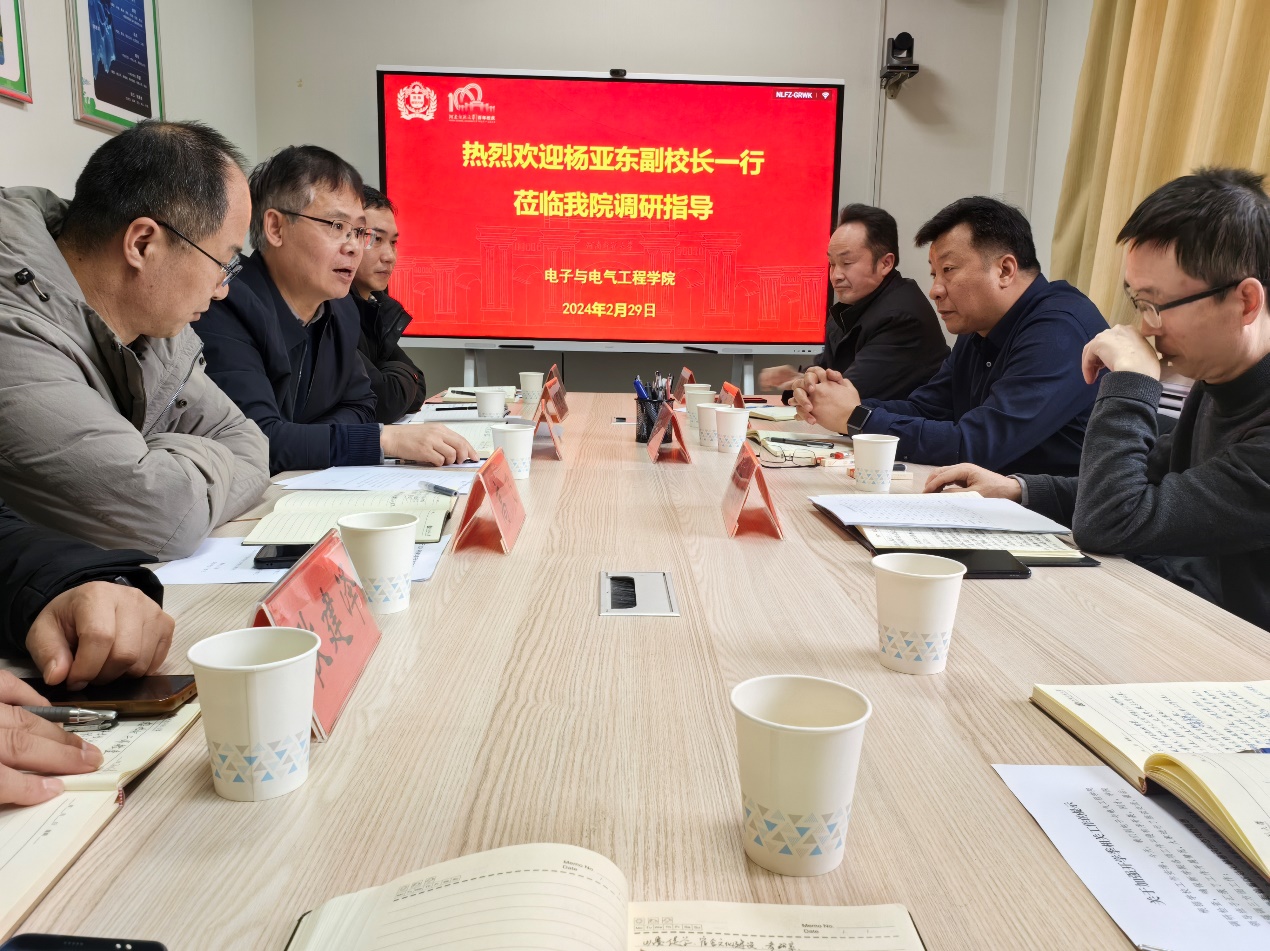 杨亚东一行听取了学院负责人关于学院教学、科研、人才培养、人才引进、合作办学、社会服务、新专业建设等方面的情况汇报,详细了解了学院当前发展现状、2024年度重点工作、存在问题和下一步打算。杨亚东指出,学院要立足现状,把困难想清楚,往好处努力,切实做好本科专业建设,把学生培养好。要把握好电子学院专业特点,利用专业优势,强化学科交叉融合,在科研项目、社会服务方面做出更大的成绩。此外,杨亚东一行对于学院发展在人才引进、实验室建设等方面遇到困难,给出了切实可行的解决措施。