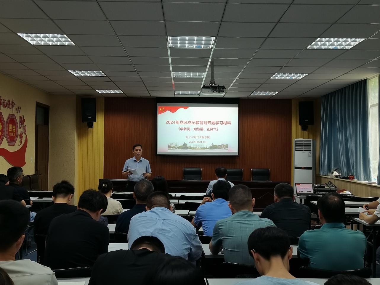 为推进党纪学习教育走深走实,持续加强党的纪律建设,进一步推动全面从严治党向纵深发展,6月12日下午,电子与电气工程学院在学院教工之家开展以“学条例、知敬畏、正风气”为主题的党风党纪专题教育学习活动,活动由学院党委副书记邓晓刚主持,学院全体教工党员参加。