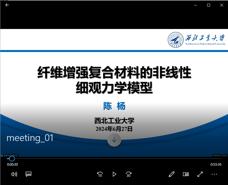 陈杨副教授首先讲解了针对纤维增强复合材料在小变形下的粘弹性问题和粘弹塑性问题,以及建立其细观力学模型实现复杂力学行为的精确预测问题;其次,深入解析了建立纤维增强复合材料在有限变形下的细观力学模型;最后,结合自己及团队的成果,总结了所提的细观力学模型精度的分析和验证情况。该讲解拓展了同学们对本学科工程应用的认知,同时也为同领域青年教师提供了新的研究思路和方法。