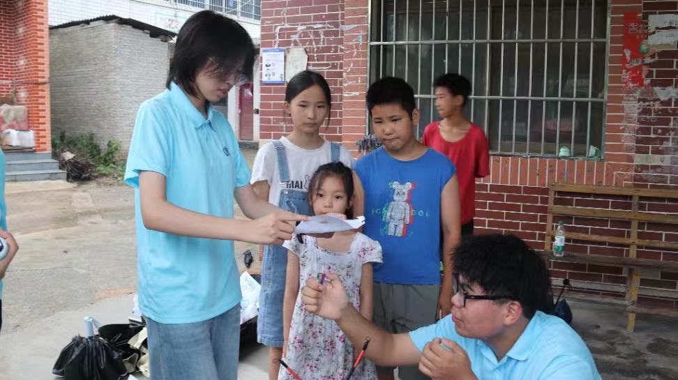 实践活动调研团到达目的地后,拿出提前准备好的实验材料以及设备,在孩子们期待的眼神中开启了科普实验小课堂。在课堂上,队员们引入生活中蕴藏的科学知识,带领孩子们开展了许多简单而有趣的小实验,例如吃软不吃硬的非牛顿流体实验、吹不出来的神奇乒乓球和自动定量补水器等。科普实验现场的孩子们沉浸在浓厚的科学氛围中,享受着科学带来的乐趣与启迪。实验后,队员们耐心地向孩子们解释了实验原理,帮助乡村儿童走近科学,爱上科学,激发了孩子们探索科学的热情。