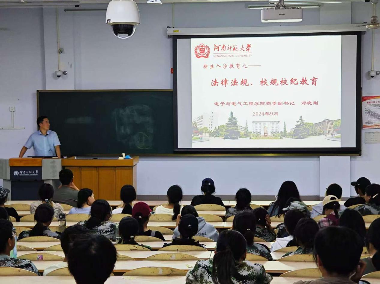 为进一步提高新生法治意识,规范学生的在校行为,强化遵纪守法意识,营造良好校园氛围,9月24日晚,我院开展“法律法规、校规校纪”新生入学教育专题讲座,2024级全体新生参加。讲座由学院党委副书记邓晓刚主讲。