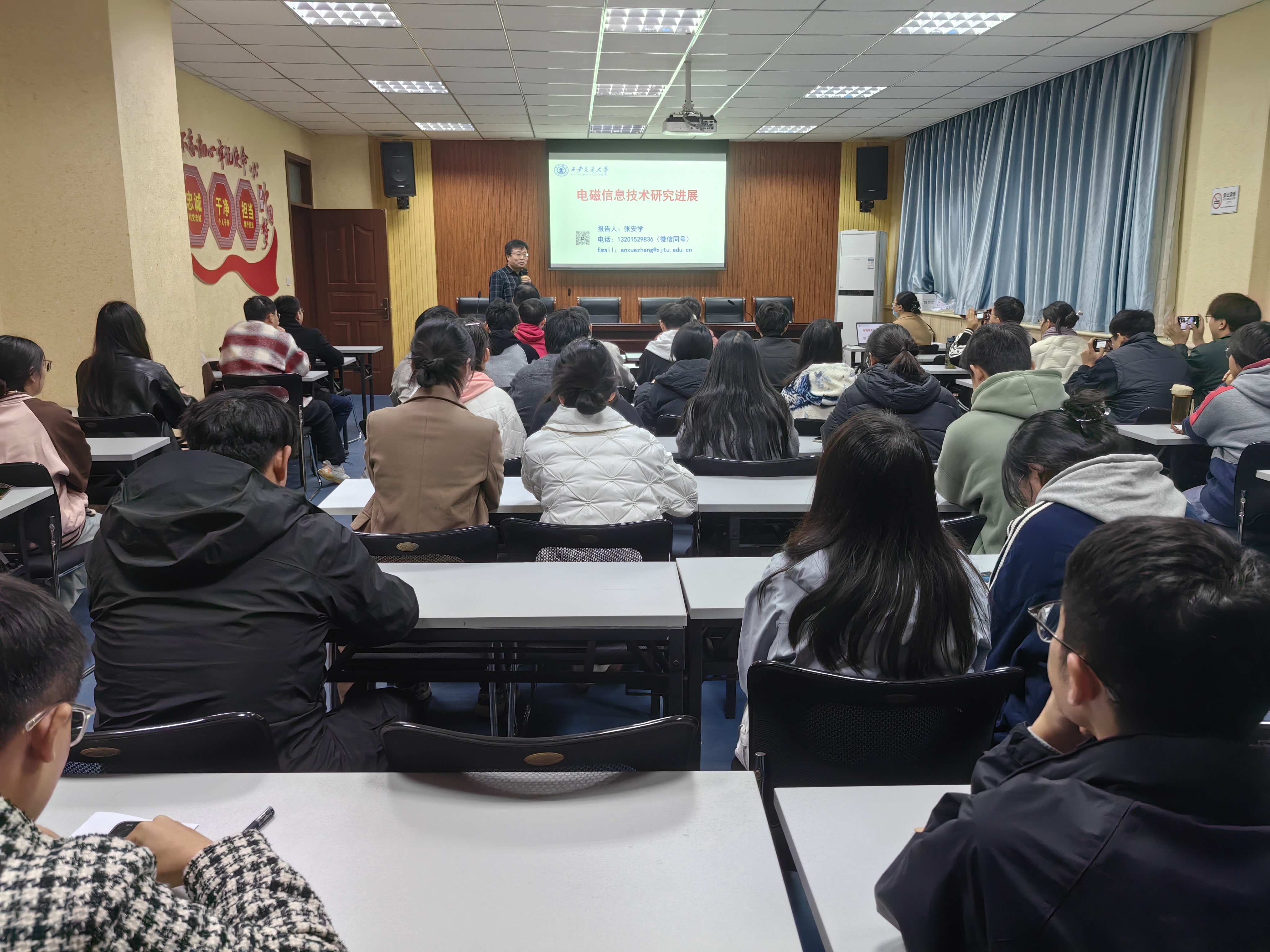 张安学教授结合自己团队的成果重点就新型天线设计技术、新型微波器件与电路设计技术、电磁信息智能调控技术、高分辨雷达系统、阵列信号处理与成像等方面的研究工作进行了讲解。该讲解提升了同学们对相关技术的应用认知,同时也为同领域青年教师指点迷津,拓宽了以后研究的思维方式与方法。
